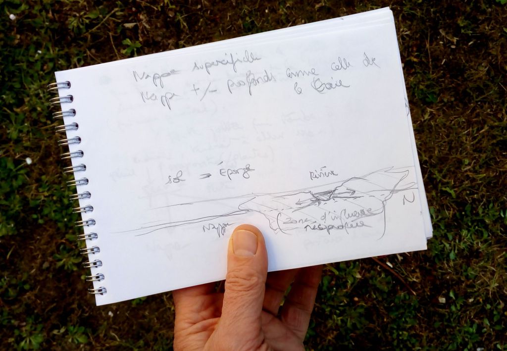 S’entendre à étendre la rivière à des réseaux ramifiés latéralement et pas seulement aux berges, à la couche immédiate. Le phénomène d’éponge des abords devrait faire considérer que la rivière étendue se gonfle et se dégonfle en fonction de l’état des précipitations, des saisons… La nappe tend ainsi à remonter ou se vider selon…