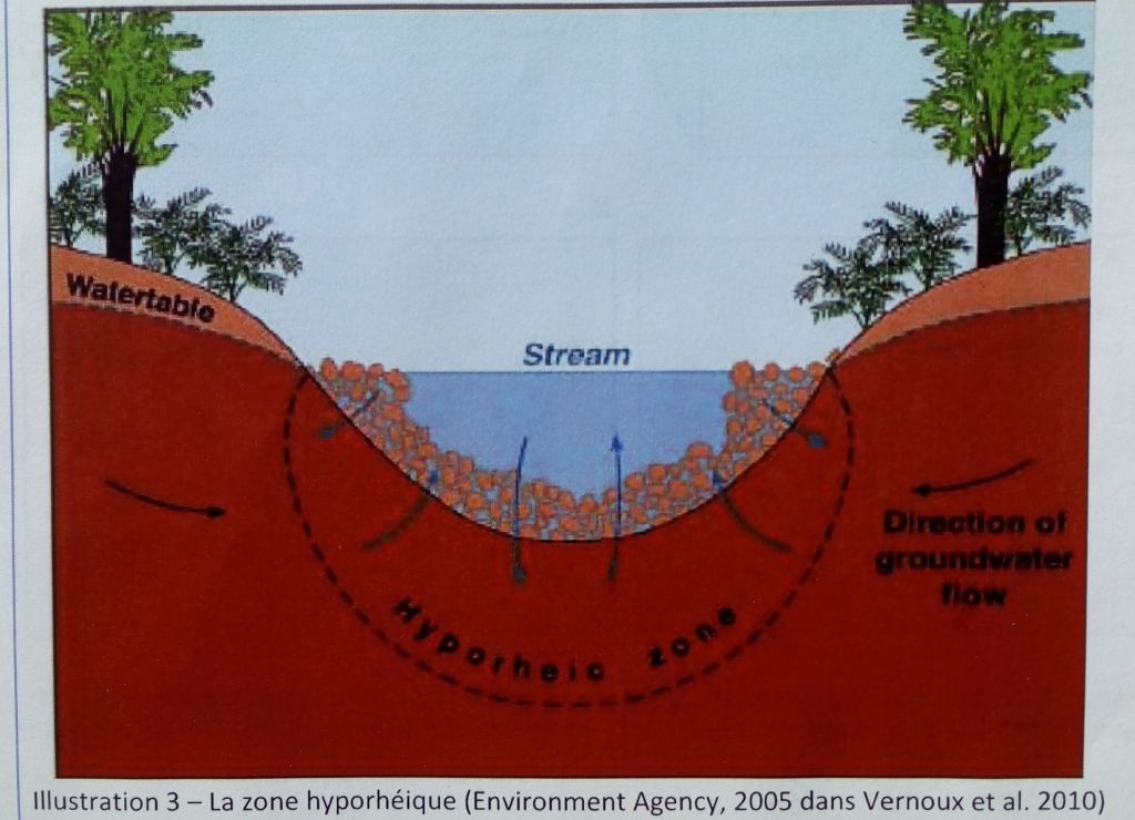 Maintenant, il ne me faut pas considérer la rivière que dans sa partie aérienne, elle est autant souterraine qu’aérienne, en lien permanent avec le sol de son lit, ses berges… et échange avec la « nappe d’accompagnement », difficile d’ailleurs à délimiter. On nomme alors « zone hyporhéique » l’interface eaux superficielles et souterraines. Elle a une fonction très dynamique dans ses échanges, ça dépend bien entendu de la perméabilité et des pentes d’écoulements. C’est une zone de mélange entre les eaux de surfaces et les eaux souterraines, donc aussi un lieu d’échange entre le souterrain et la surface !