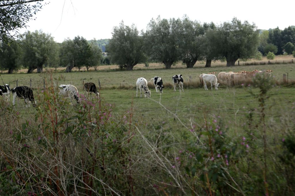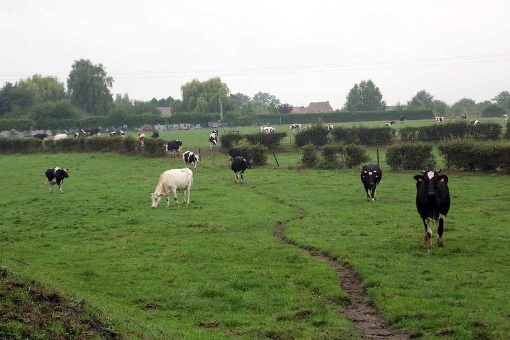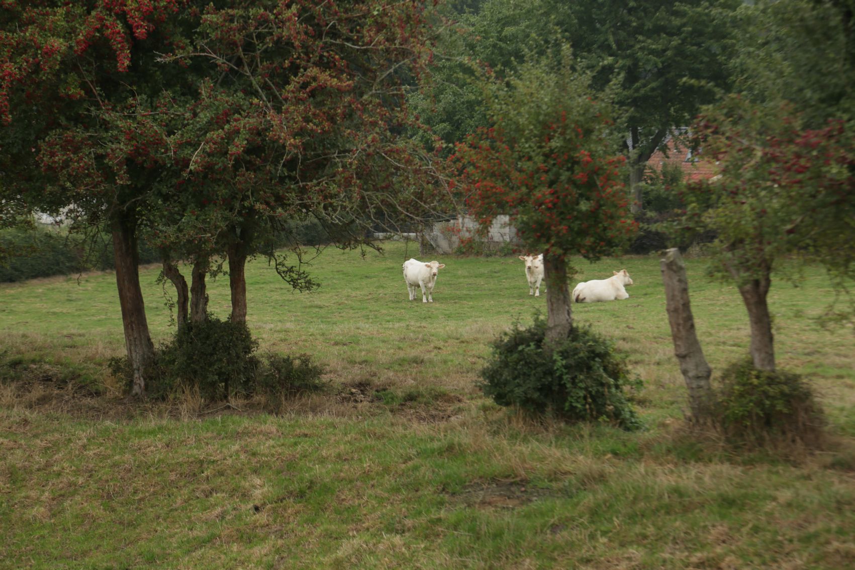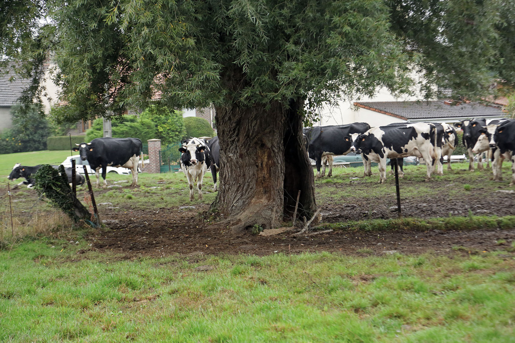 Il pointe le talus bordé d’une haie, le sol est trempé, ponctué de bouses de vaches. D’ailleurs, sont pas loin les vaches : nous en voyons à gauche, surtout au-delà de la clôture… Font maigres : sont des laitières.
