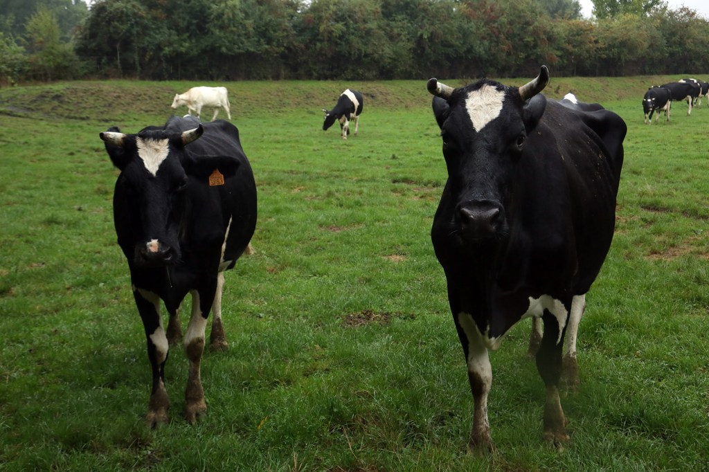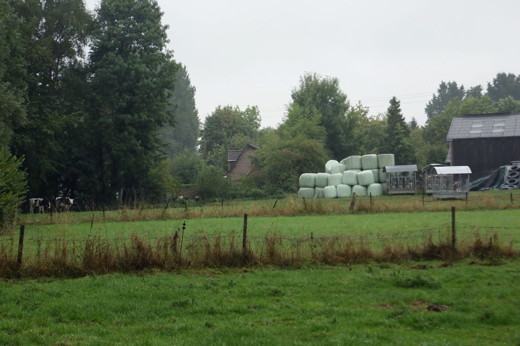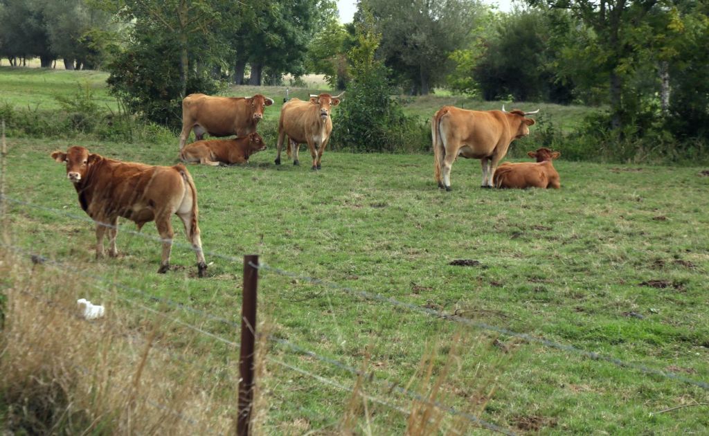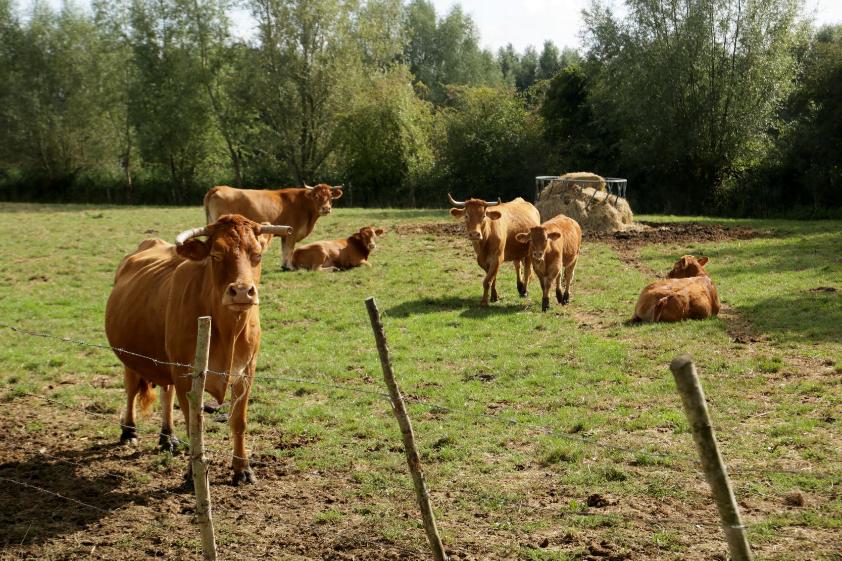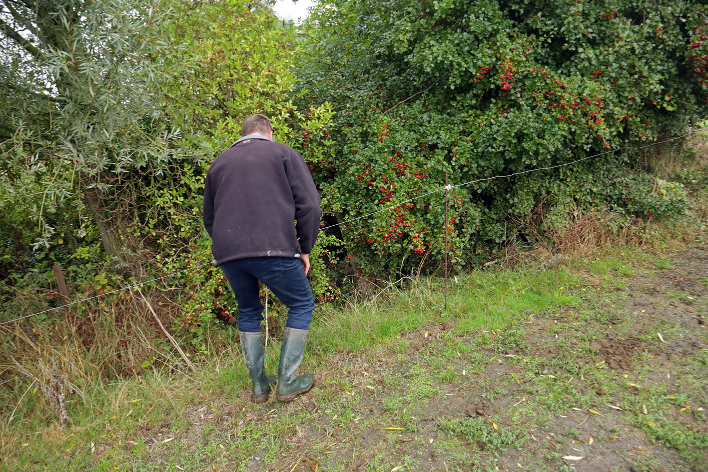 Il pointe le talus bordé d’une haie, le sol est trempé, ponctué de bouses de vaches. D’ailleurs, sont pas loin les vaches : nous en voyons à gauche, surtout au-delà de la clôture… Font maigres : sont des laitières.