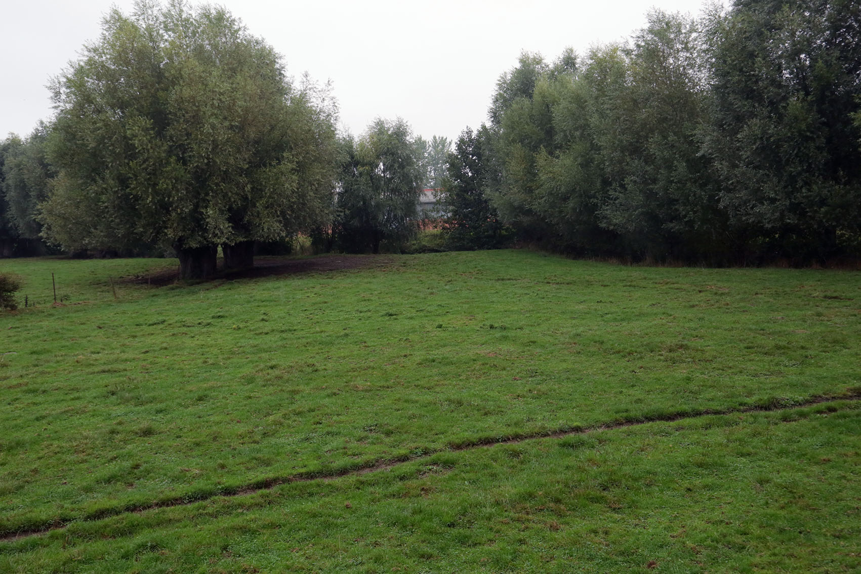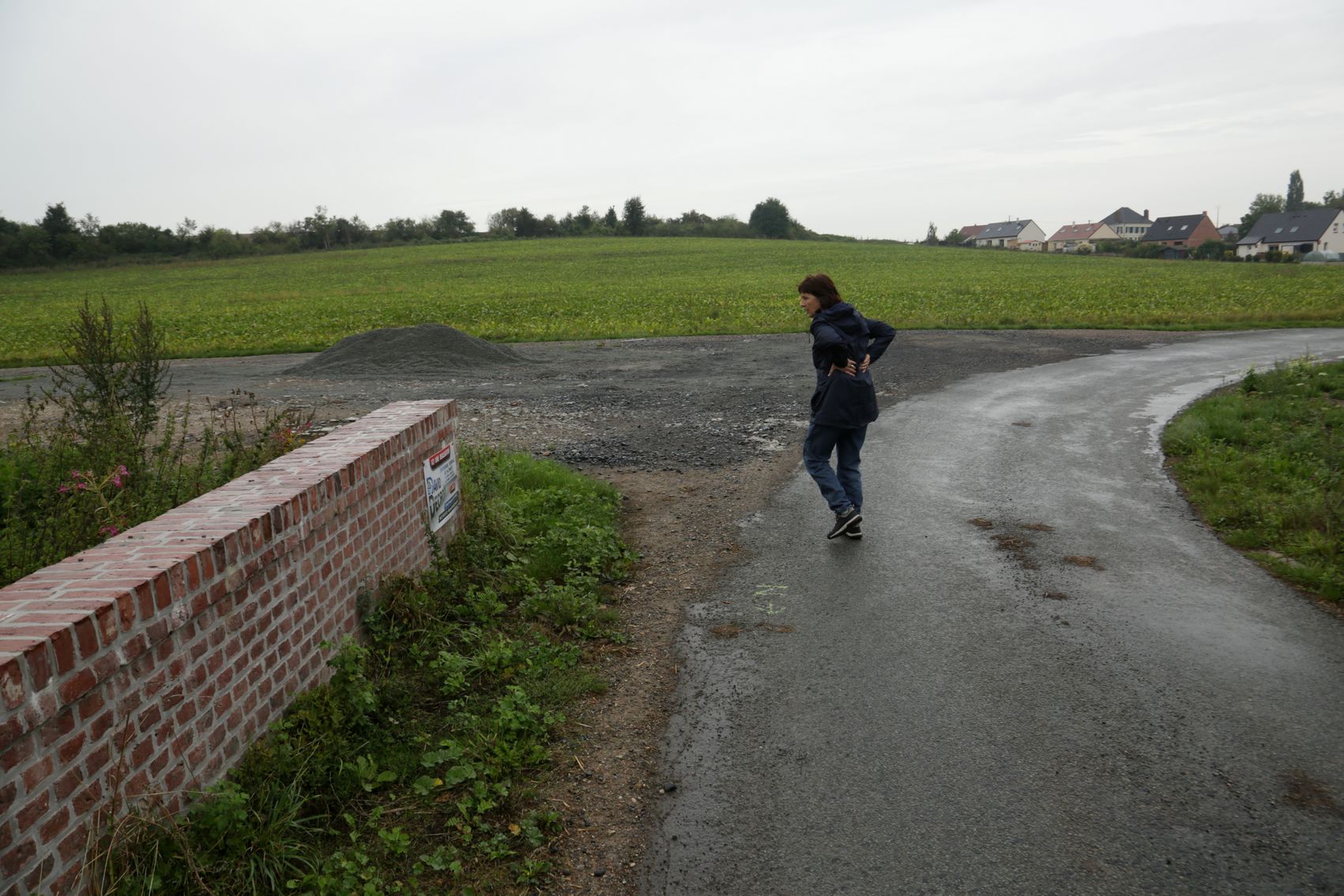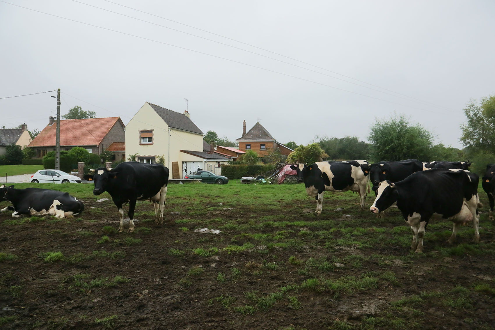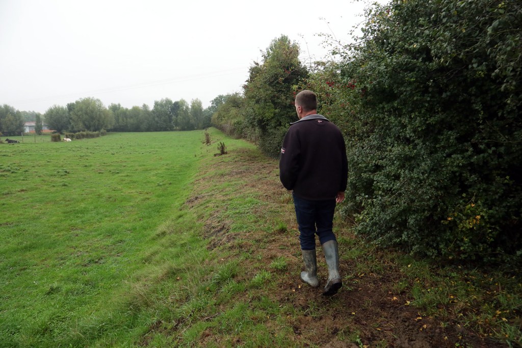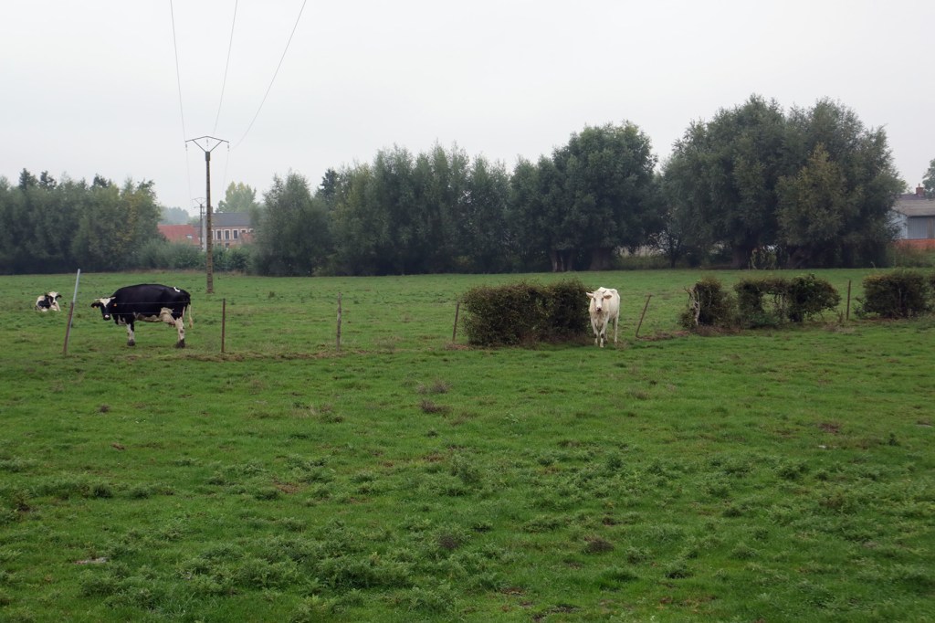 Rendez-vous avec monsieur Verwaerde, maire de Quernes. Il est 15h10, nous prenons la direction des pâtures à Bernard Labitte, au nord du village… nous tournons rue du Nocquet jusqu’à la barrière à l’entrée du pré. Le temps est couvert, plutôt à la pluie, dommage.