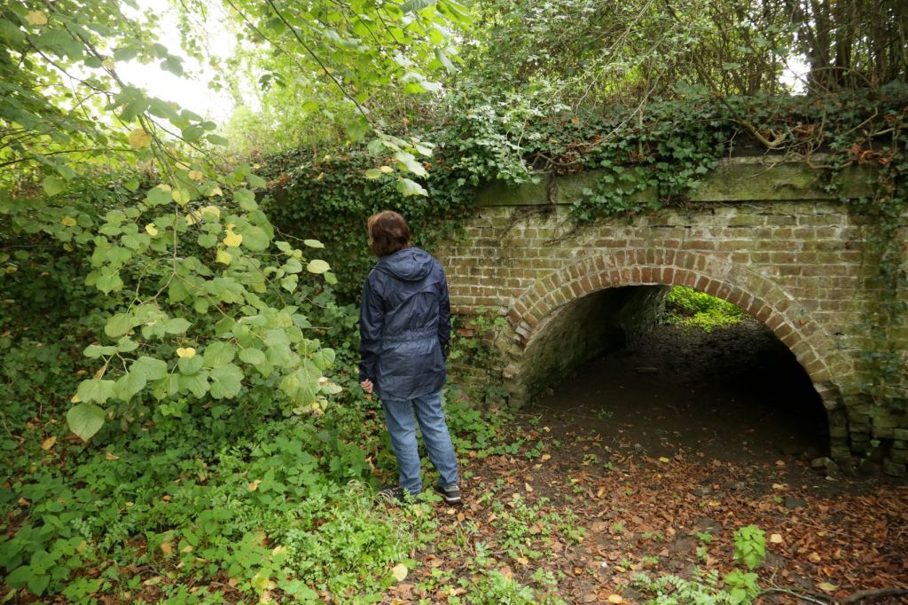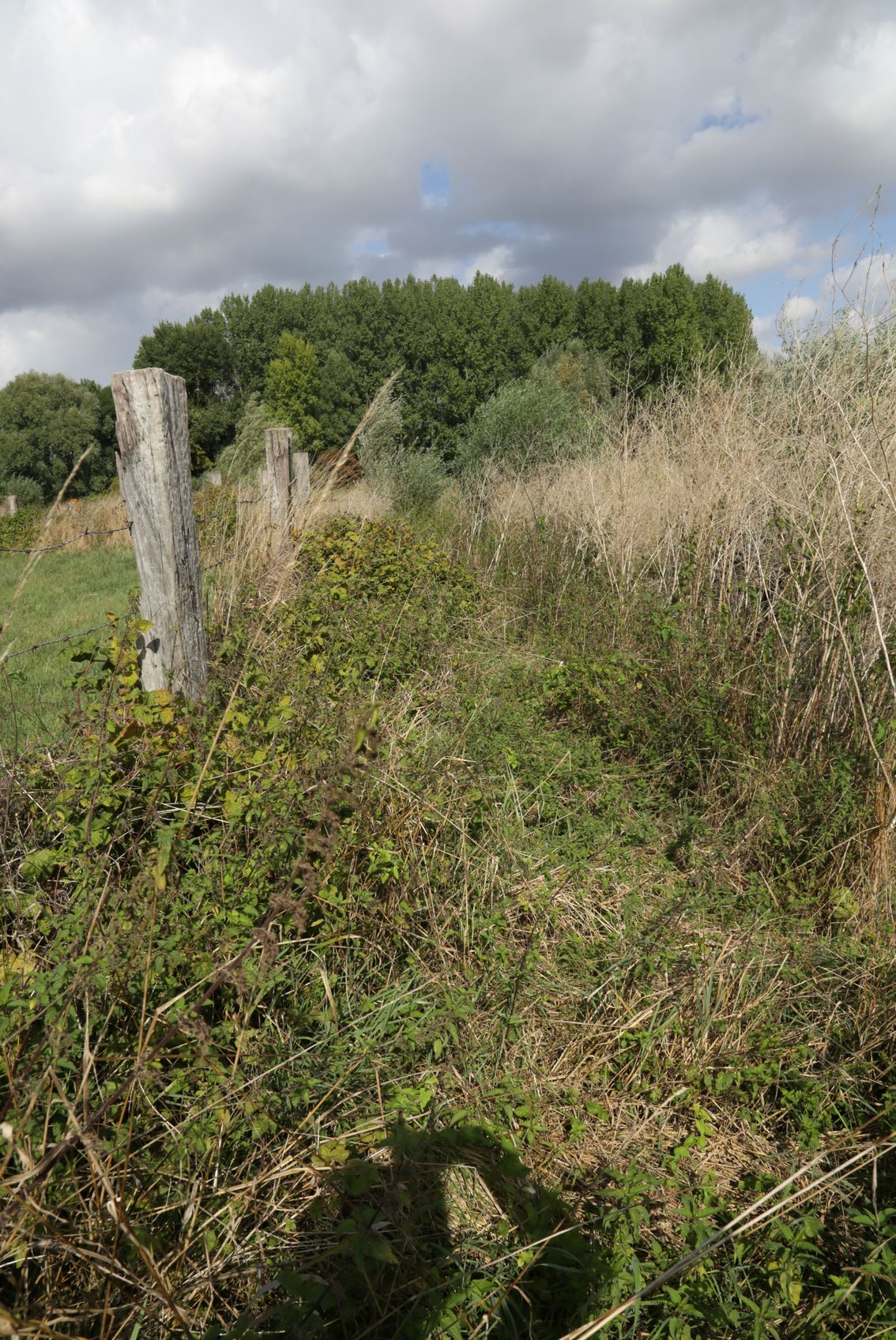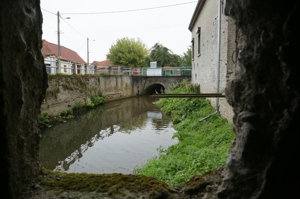 En regagnant la route qui va à Witternesse, au bout du talus de l’ancien chemin de fer, nous entrevoyons un autre pont, il enjambe un fossé, sec en ce moment… La végétation alentour ne nous trompe pas, l’eau doit abonder en hiver, sommes entrés dans la zone des marais de Witterenesse. Nous prenons le temps de l’observer, de passer de l’autre côté du merlon.
