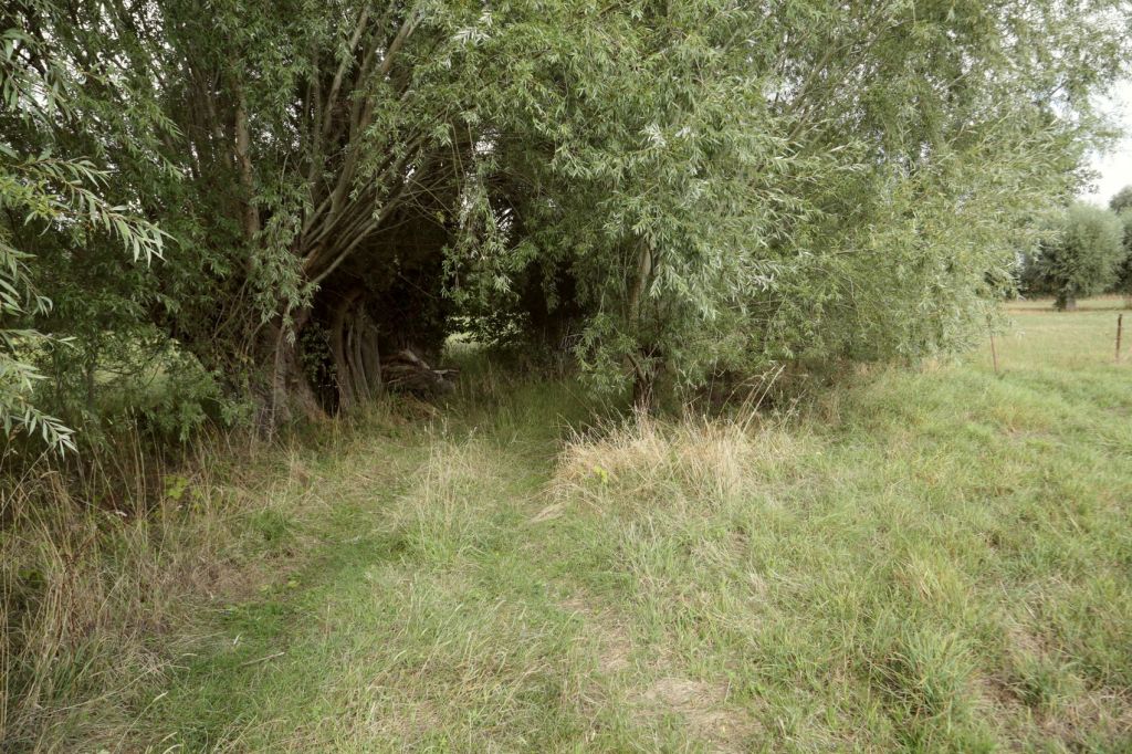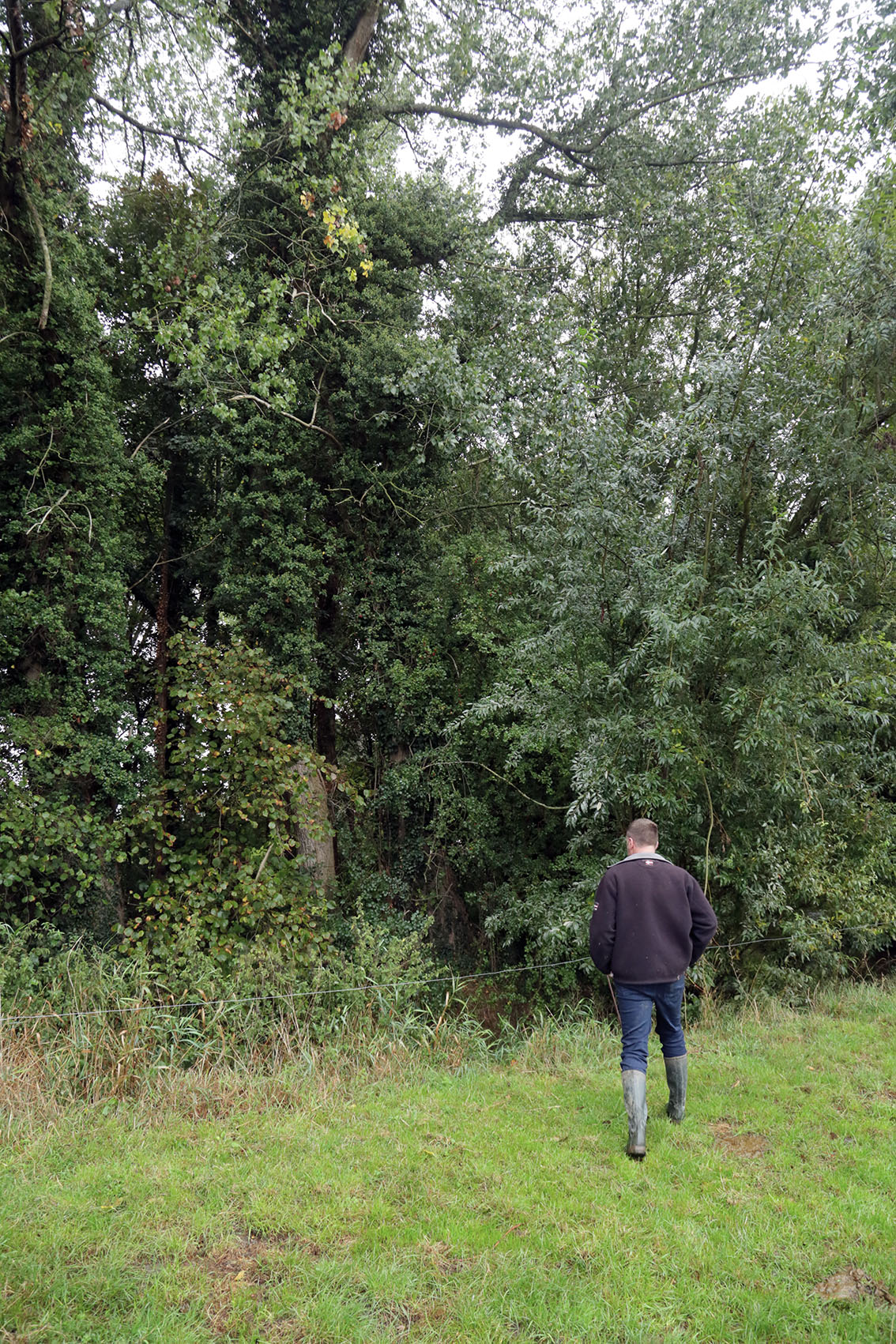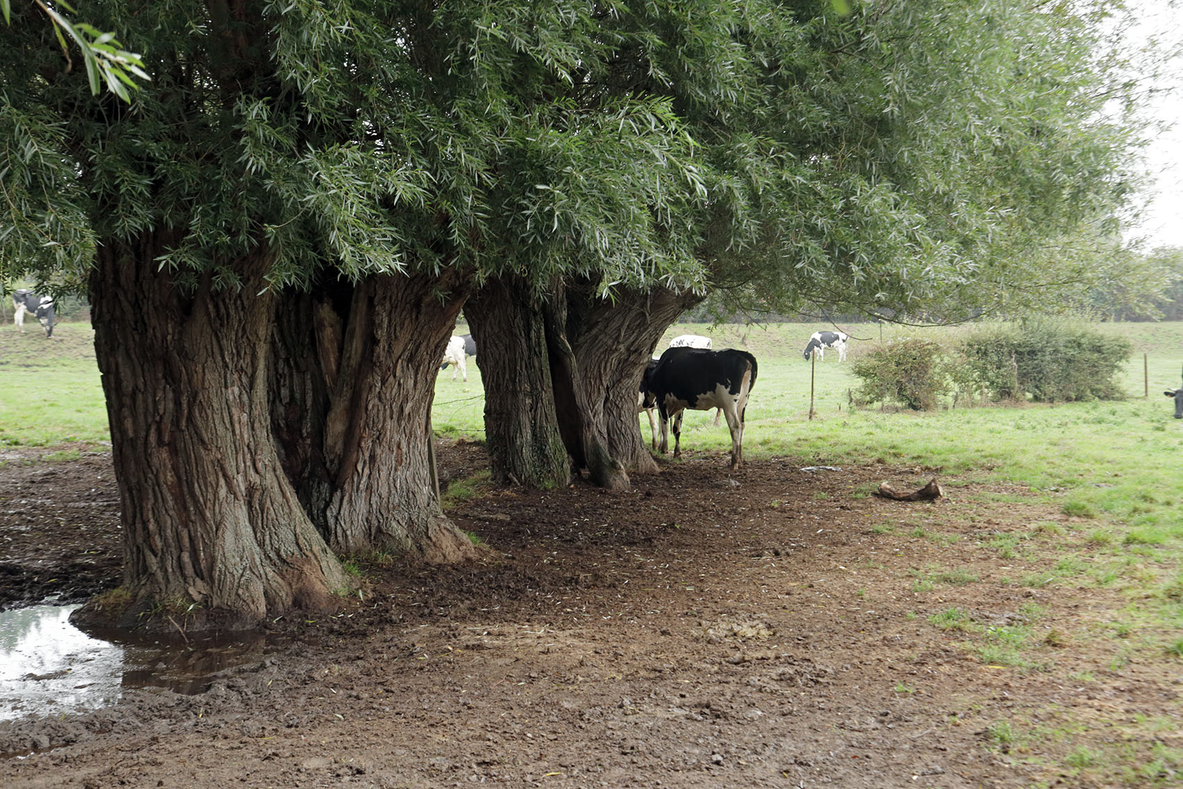 Prendre le passage entre la clôture et le saule blanc : la boue, un malaxé de terre et de bouses, les bêtes ont l’habitude d’attendre là.