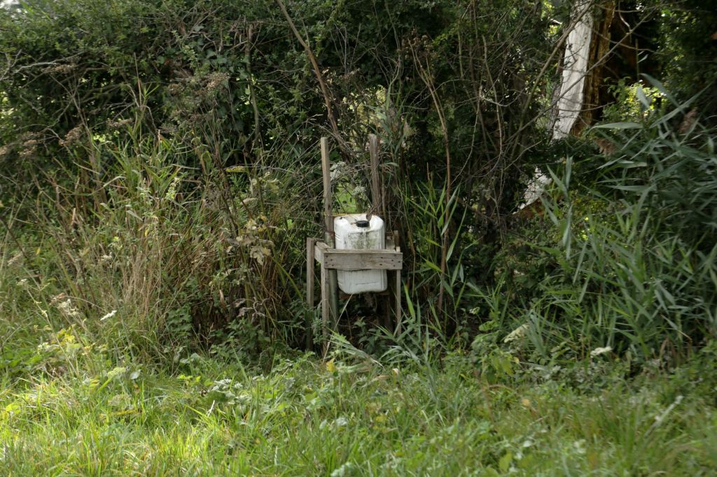 Patrick entreprend de me montrer cette source cachée : me présente la scène, où l’eau était montée ; se fait expressif ; embrasse l’étendue du débordement – ou plutôt la résurgence – car il m’entraîne au tampon : elle passe là-dessous…