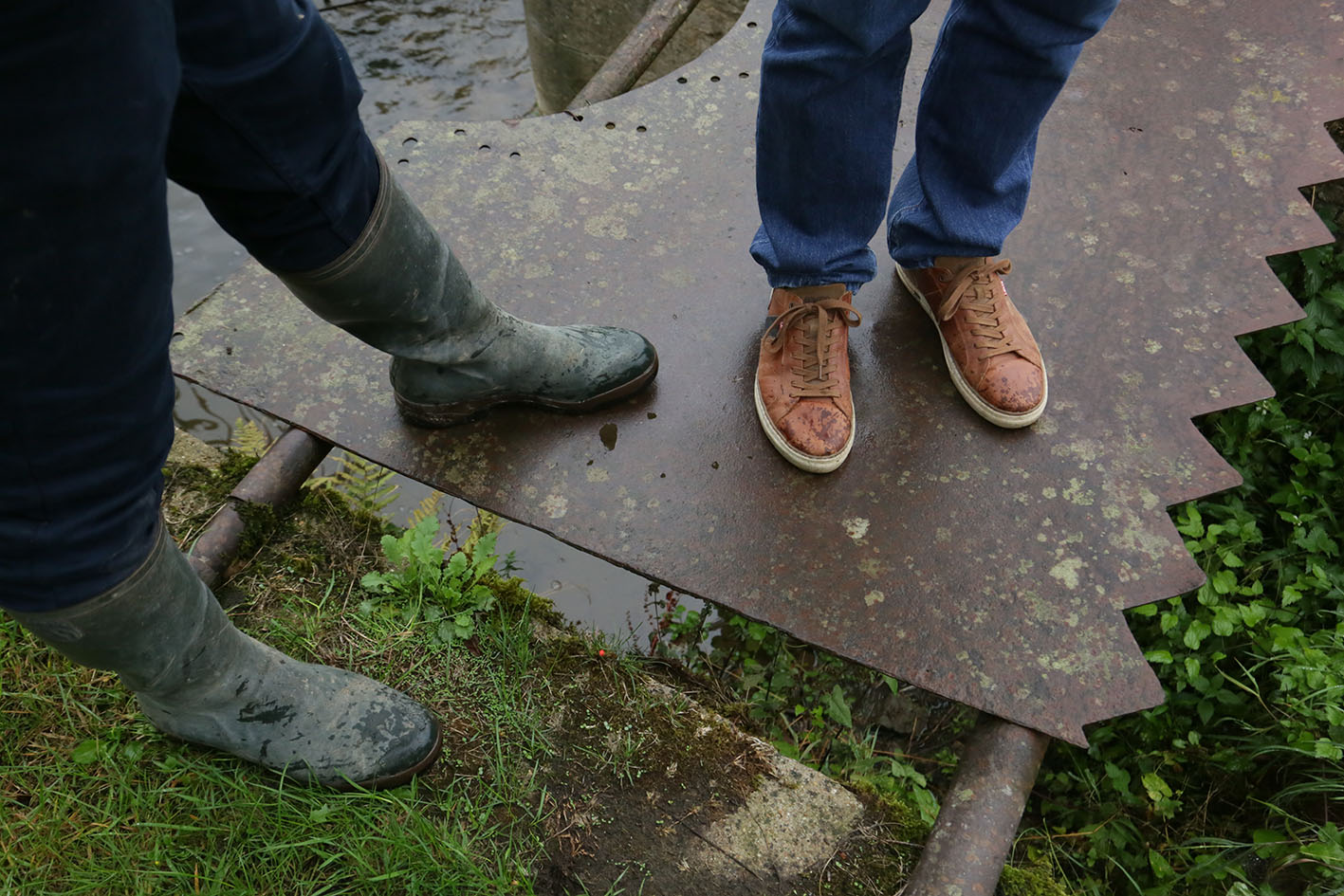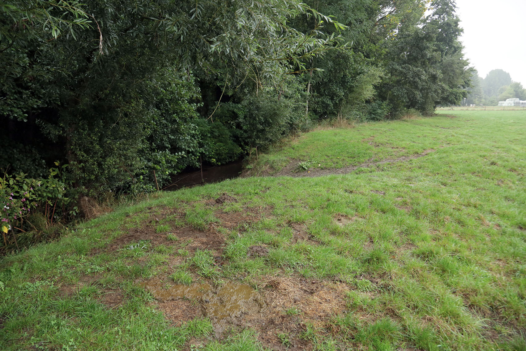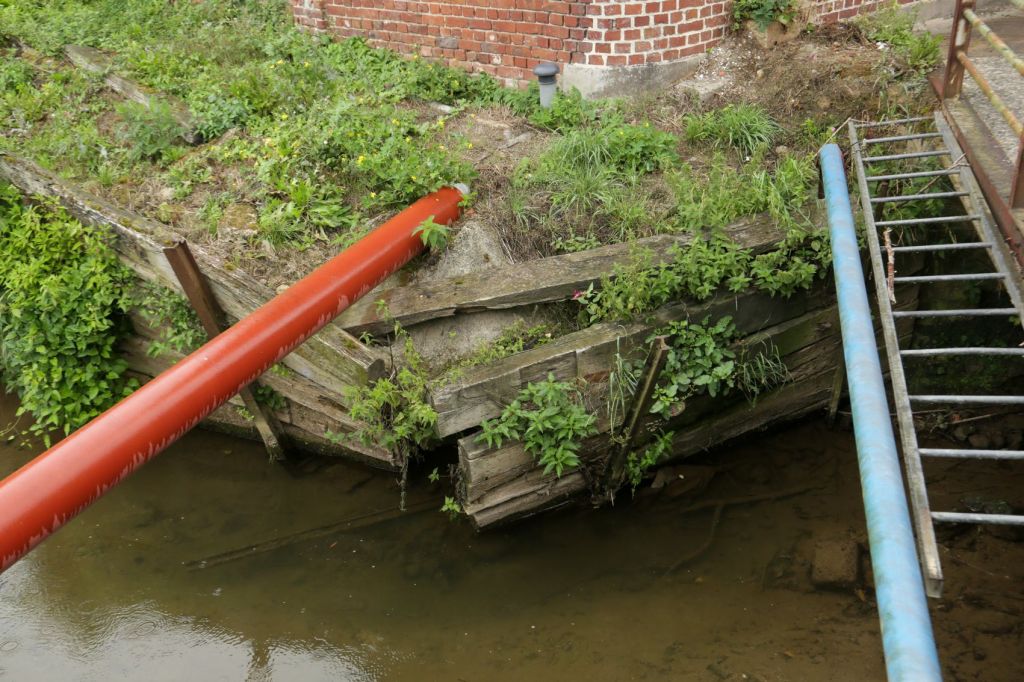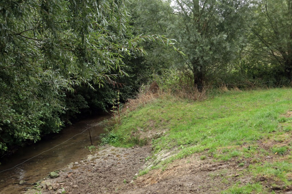 Demi-tour donc, et suivre la berge vers l’amont ; se refaire le film à l’envers, et nous arrêter un temps au passage qui traverse l’aiguillage. Patrick se souvient bien qu’il y avait là-dessous une passerelle, a été en partie défaite par l’aménagement de la pâture par l’agriculteur.