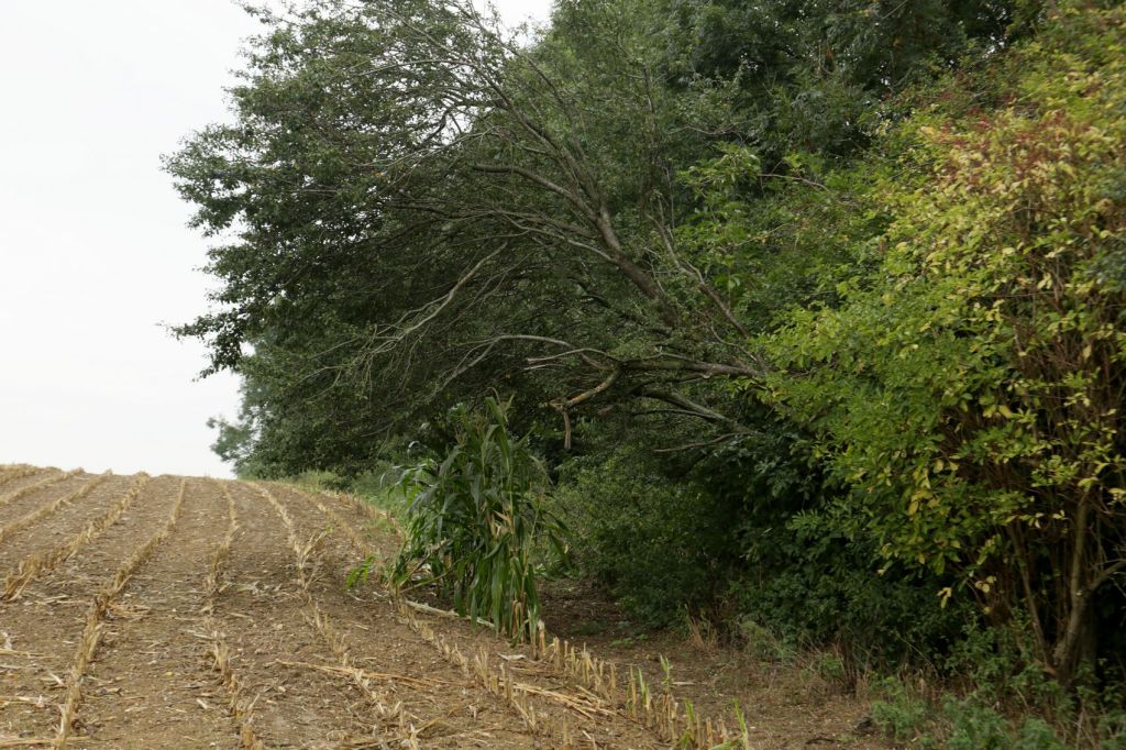 Fabienne a poursuivi, au-delà du chemin, pour voir ; je la rejoins : tracteur au loin, champ en continu… Retourner. Un arbre penché abrite quelques tiges de maïs qui ont échappé à la grande faucheuse. La scène fait image.
