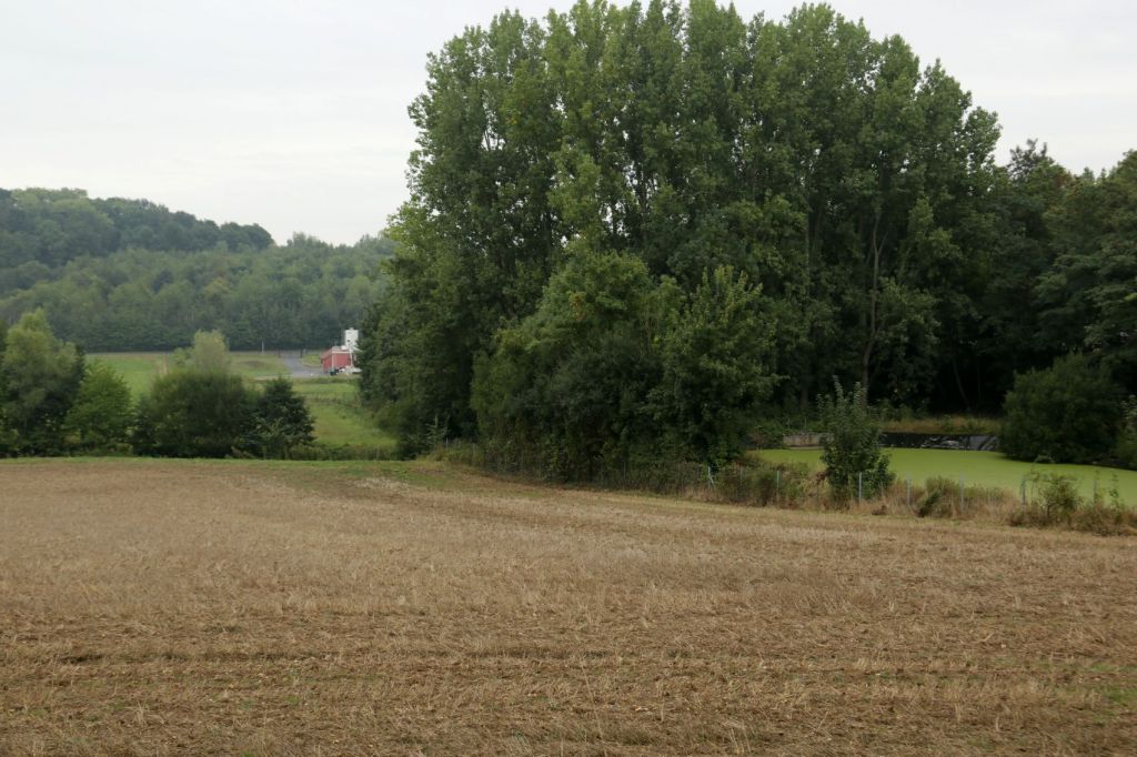 Mais, ne nous y trompons pas, en sortant du chemin sinueux, un champ, a été récolté, laissant émerger des chaumes ; pentu, il dessine une courbe qui vient buter contre un autre espace boisé… Là, normalement, je devrais trouver le chemin qui va nous ramener au village… Les bruits de l’autoroute se sont imposés à nous ; à travers le rideau d’arbres, on aperçoit des camions qui défilent.