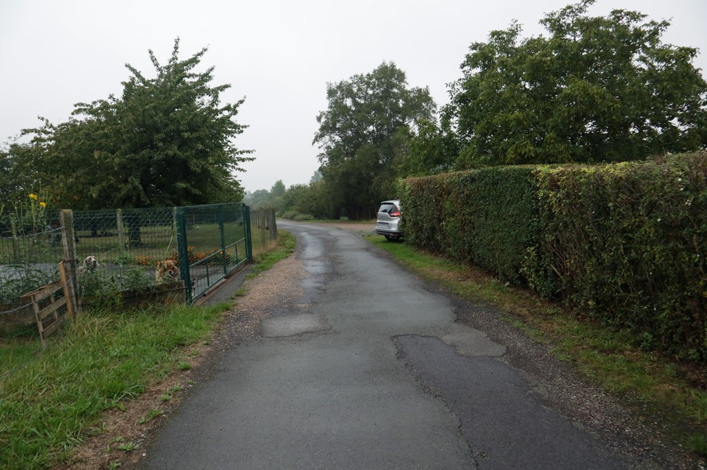 La route est hostile, pas de bas côté aménagés, les voitures m’affolent, je bifurque : tenter par la ferme de Mongré. Longer une haie sur la gauche, elle accompagne un fossé, et finalement buter sur une autre qui est renforcée de barbelés, aïe, frustration : des maisons sont toutes proches derrière, rageant… M’oblige à remonter sur la route…