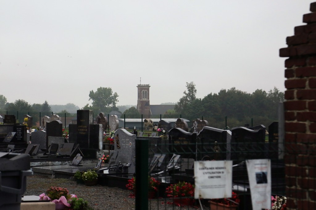 En continuant d’avancer, sur la gauche, le cimetière et la vue sur le clocher de Witternesse… L’autre village, paraît bien proche… En face, la barrière, est cadenassée ; Patrick Verwaerde l’enjambe et je le suis : hop, dans les champs !…