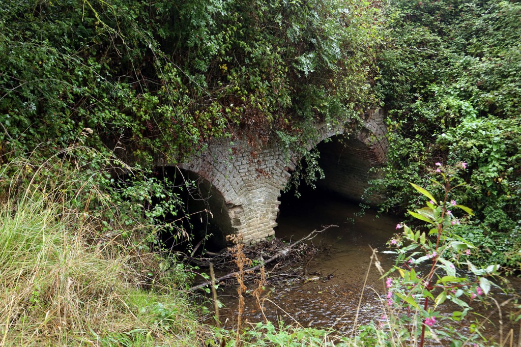 Persévérants, nous perçons la friche ; nos tentatives se révèlent fructueuses : le cours d’eau coule en limite d’un pré et nous décelons le pont décrit par Patrick Verwaerde, d’une double arche il enjambe la Lacquette, me rappelle celui trouvé à Estrée-Blanche, quoique moins spectaculaire.