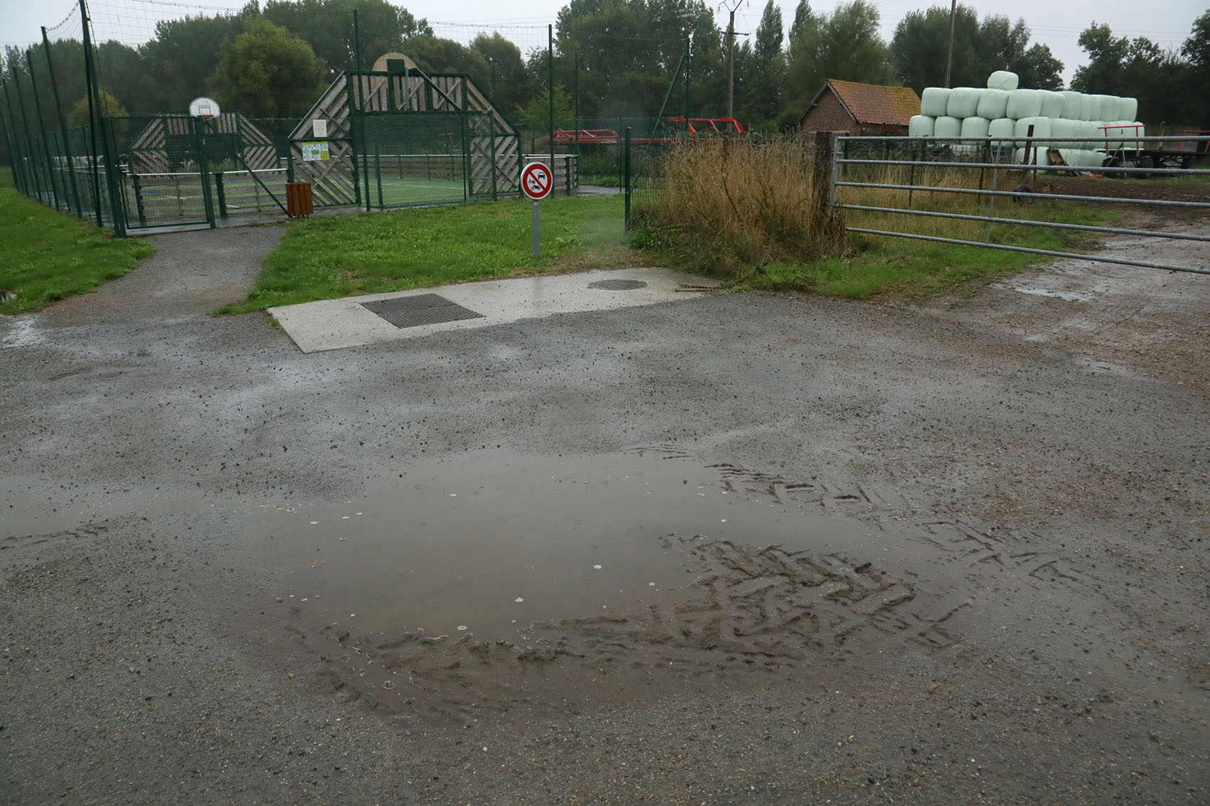 photo 1 – Sûrement l’ancien lit de la rivière avant construction de notre moulin qui vient remplir la grand rue – photo 2 – pour retourner à la rivière, et – photo 3 – la sur-verse dans la rue du marais, vers ce terrain en limite de commune avec Witternesse – crédit photo et texte : Patrick Verwaerde.