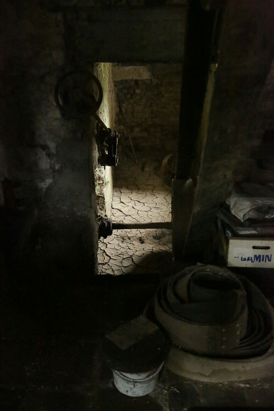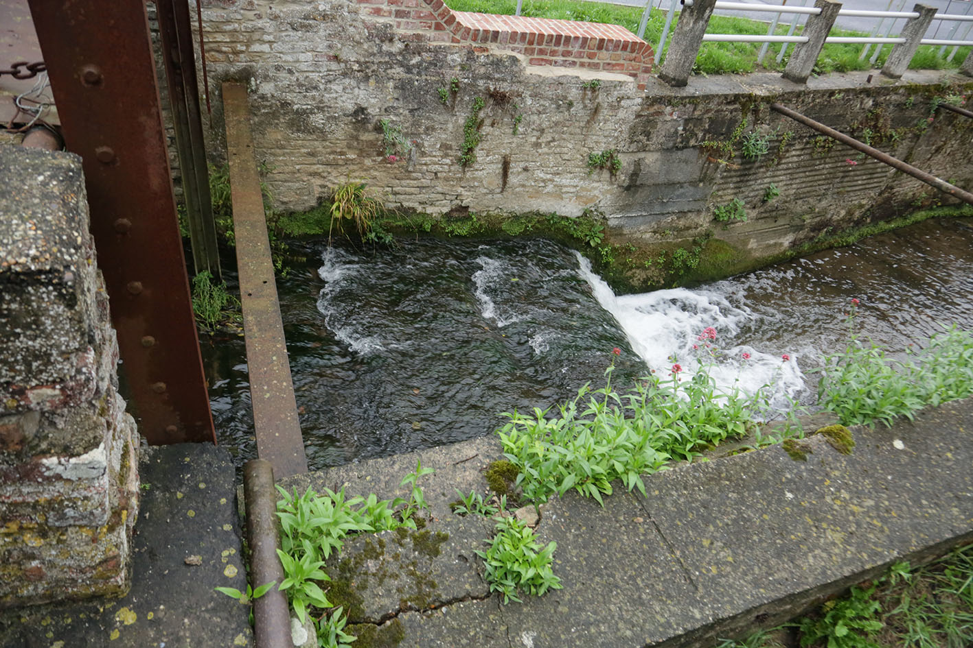 Nous redescendons pour nous rendre à l’extérieur, aller à la source : voir le passage de l’eau, la force motrice du moulin, cette énergie qui par moment faisait défaut…