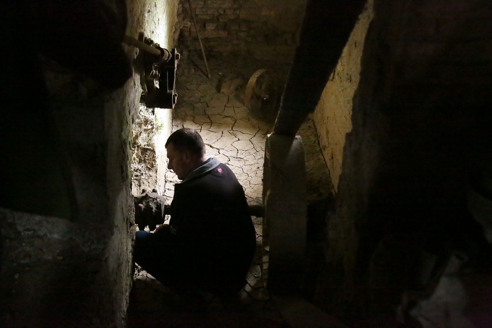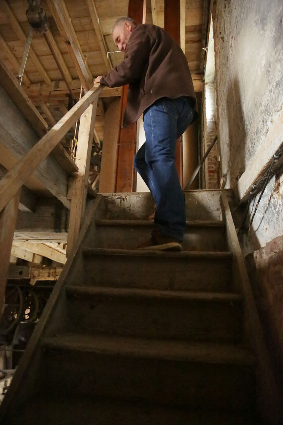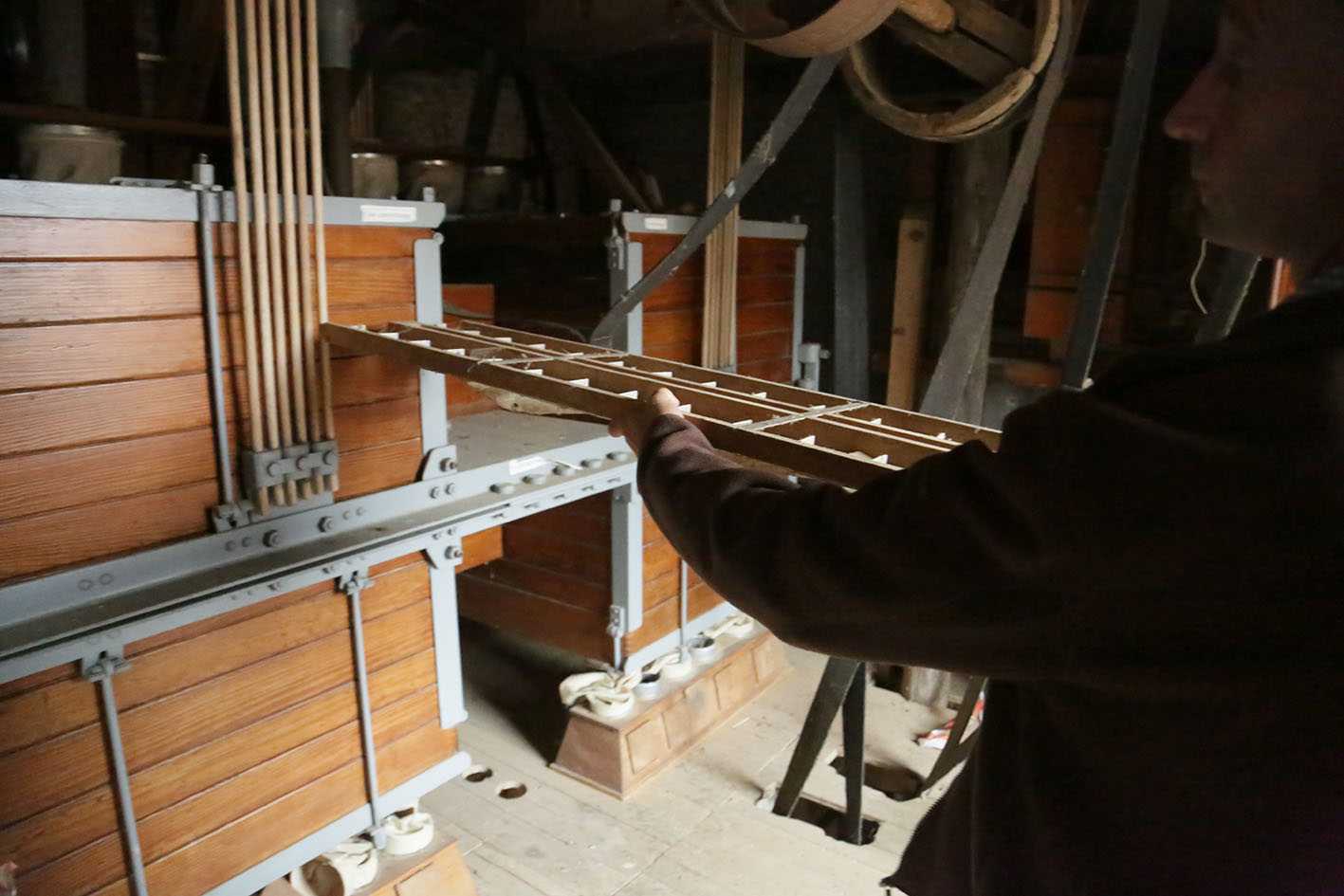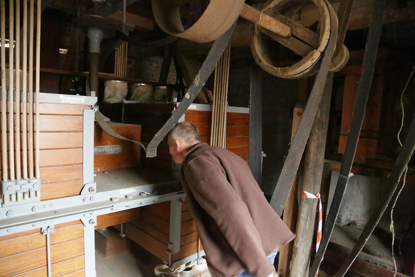 Eric nous explique, pas à pas, étage après étage, les pièces de fonctionnement de cet impression intérieur : tout en bas, la mise en route de la turbine ; le début du cycle du grain qui va monter et redescendre plusieurs fois, au fil des broyages, les tris : du petit son et du gros son, des farines qui, au passage auront subi des tamisages déterminant sa finesse… jusqu’à la mise en sac.