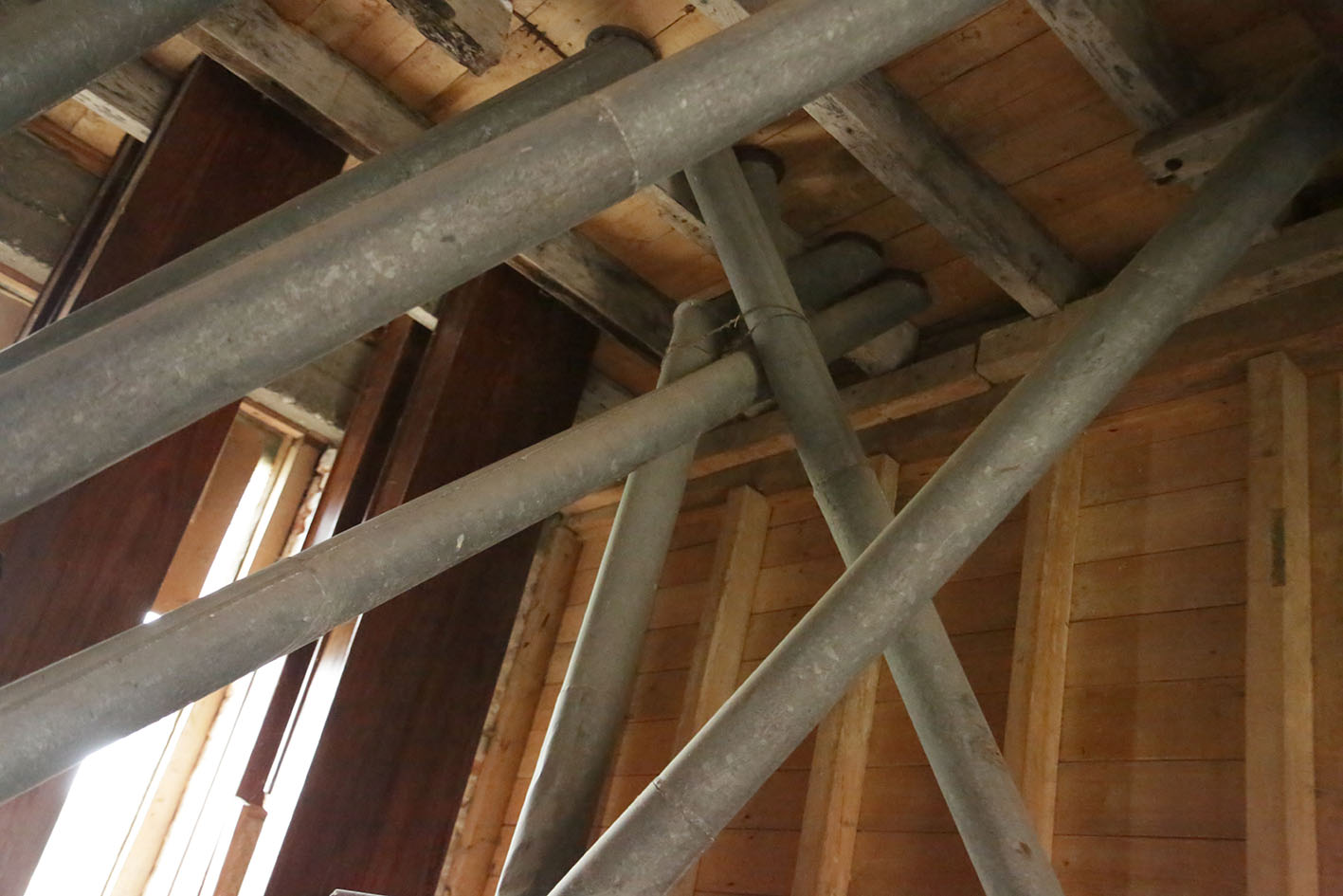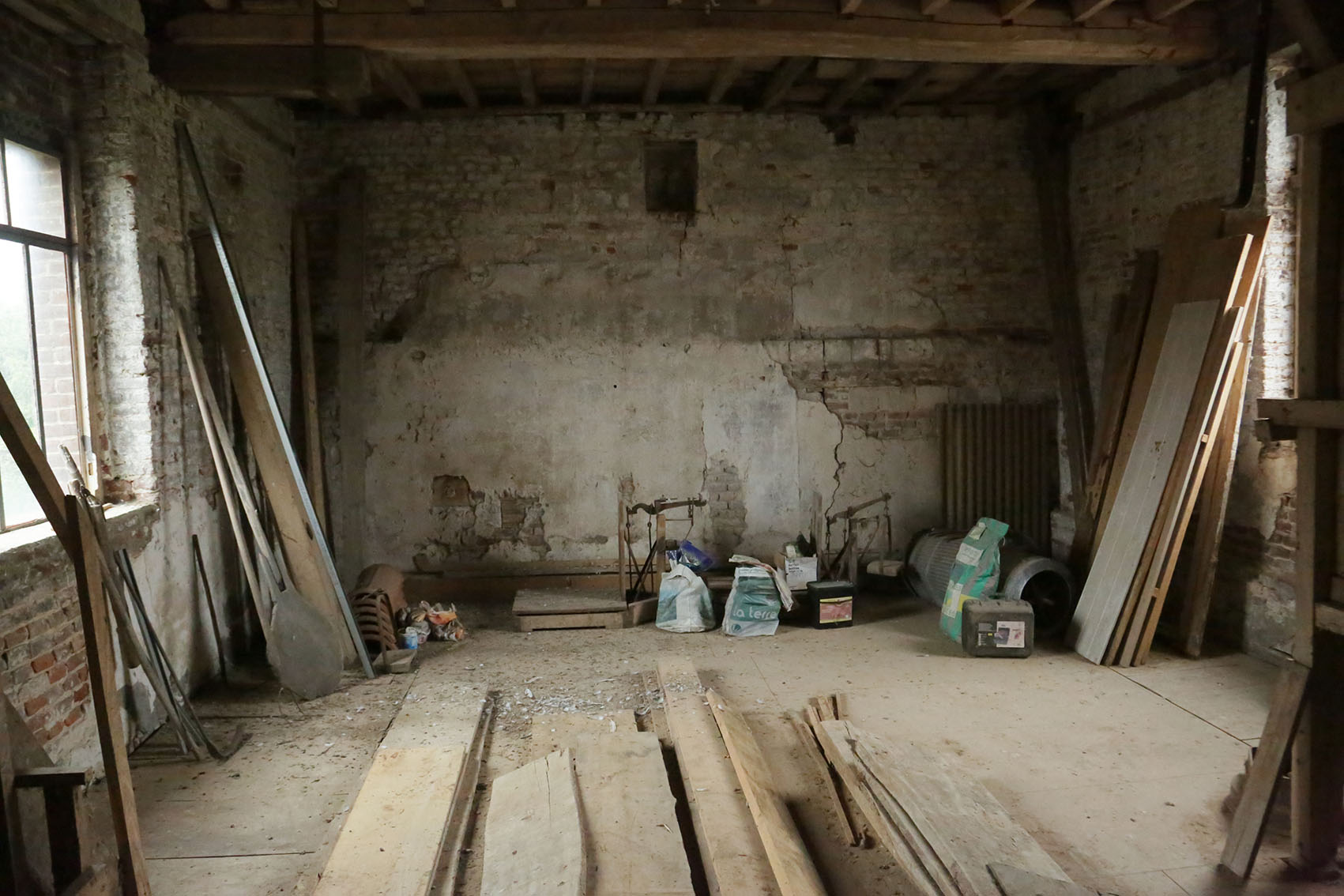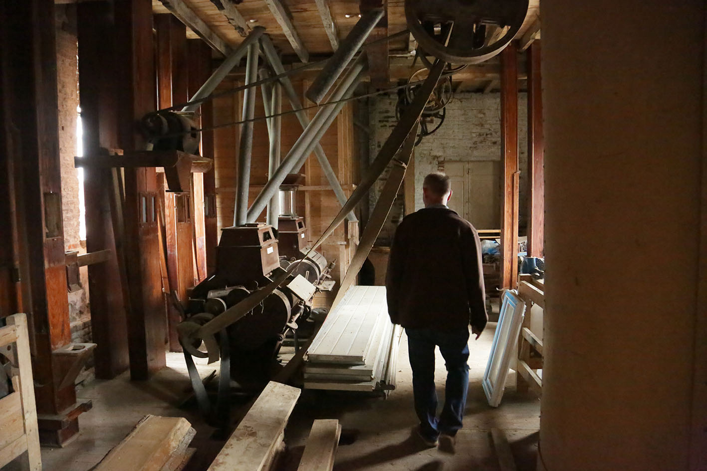 Eric nous reçoit dans la cour et commence par me parler du moulin, de l’extérieur : en haut d’un pignon, le rappel que le moulin a produit de l’électricité au début du 20e siècle ; les marques lisible d’un rehaussement du bâtiment avec l’évolution du processus de production de la farine ; la scie qui permettait de faire des planches avec des troncs d’arbres, pour l’entretien du moulin…