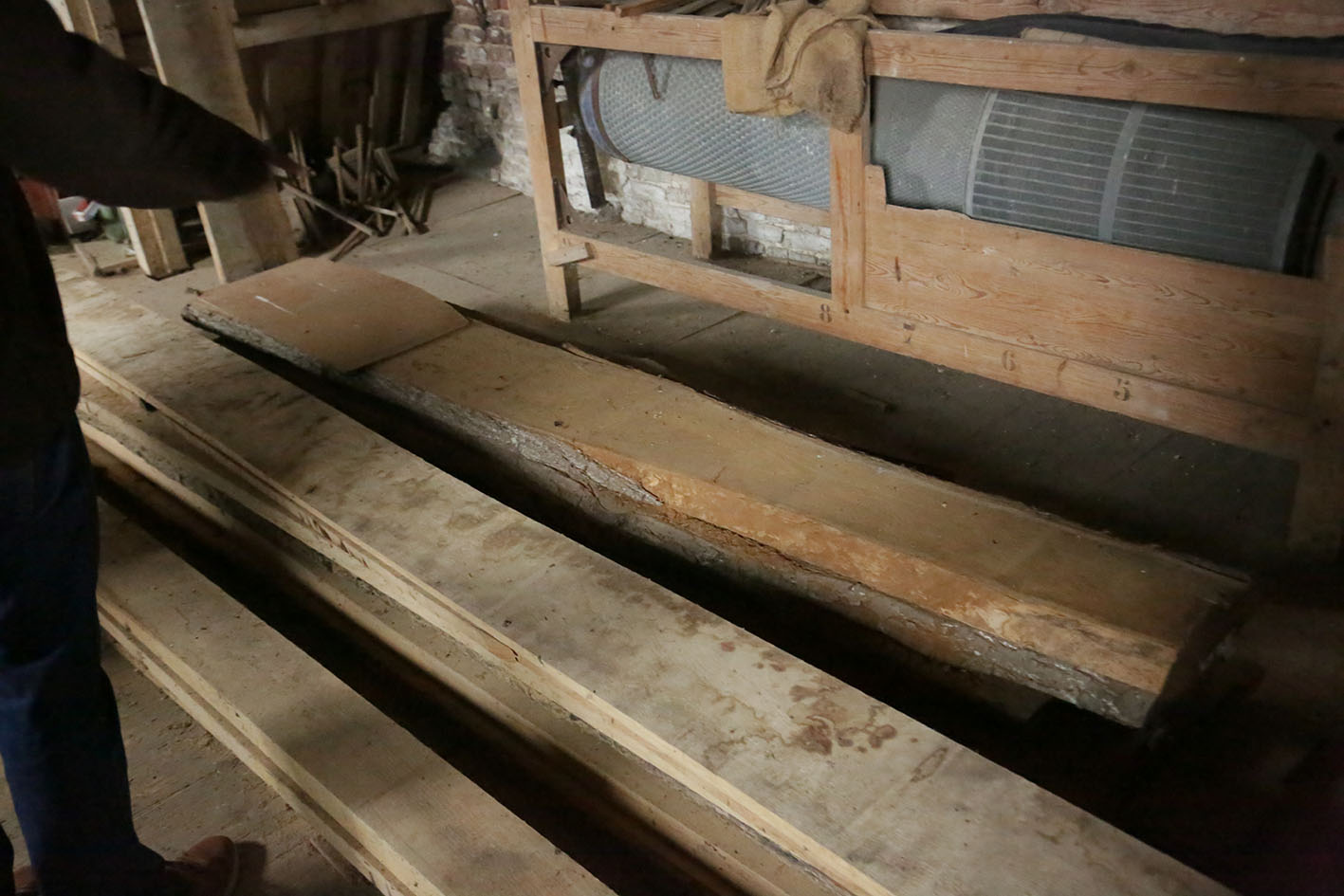 Là, je comprends que l’histoire familiale imprègne ce lieu, Eric nous entraîne dans un voyage dans le temps du moulin, du rez-de-chaussée au dernier étage.