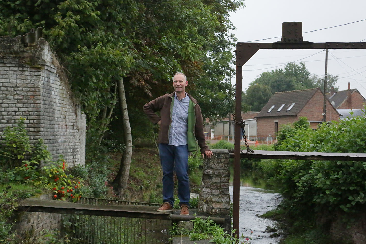 Poursuivre, commenter… Ici, un nid de poules d’eau ; là, des palplanches protégeant la berge, et puis, tout au bout, une haie qui arrête la pâture : « derrière, c’est le moulin de Witternesse ».
