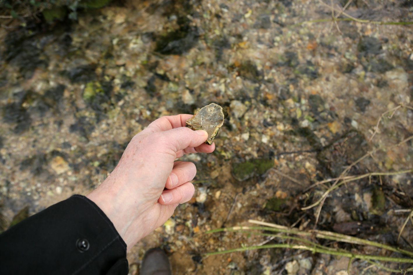 En arrivant au niveau des dernières maisons de la rue de Livossart à Honnighem, retrouver la source. L’eau y est claire… ai prélevé 3 petits morceaux de silex…