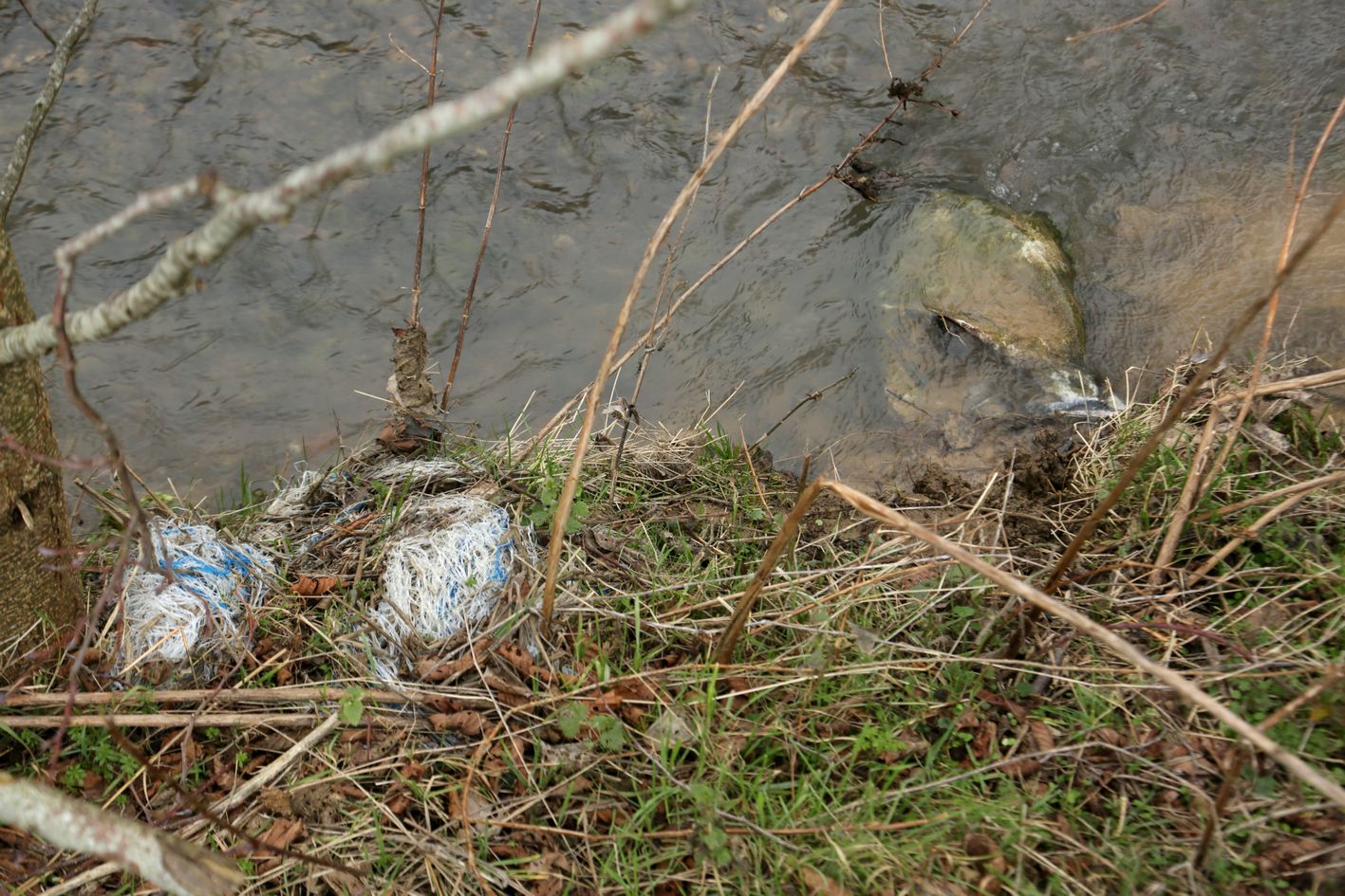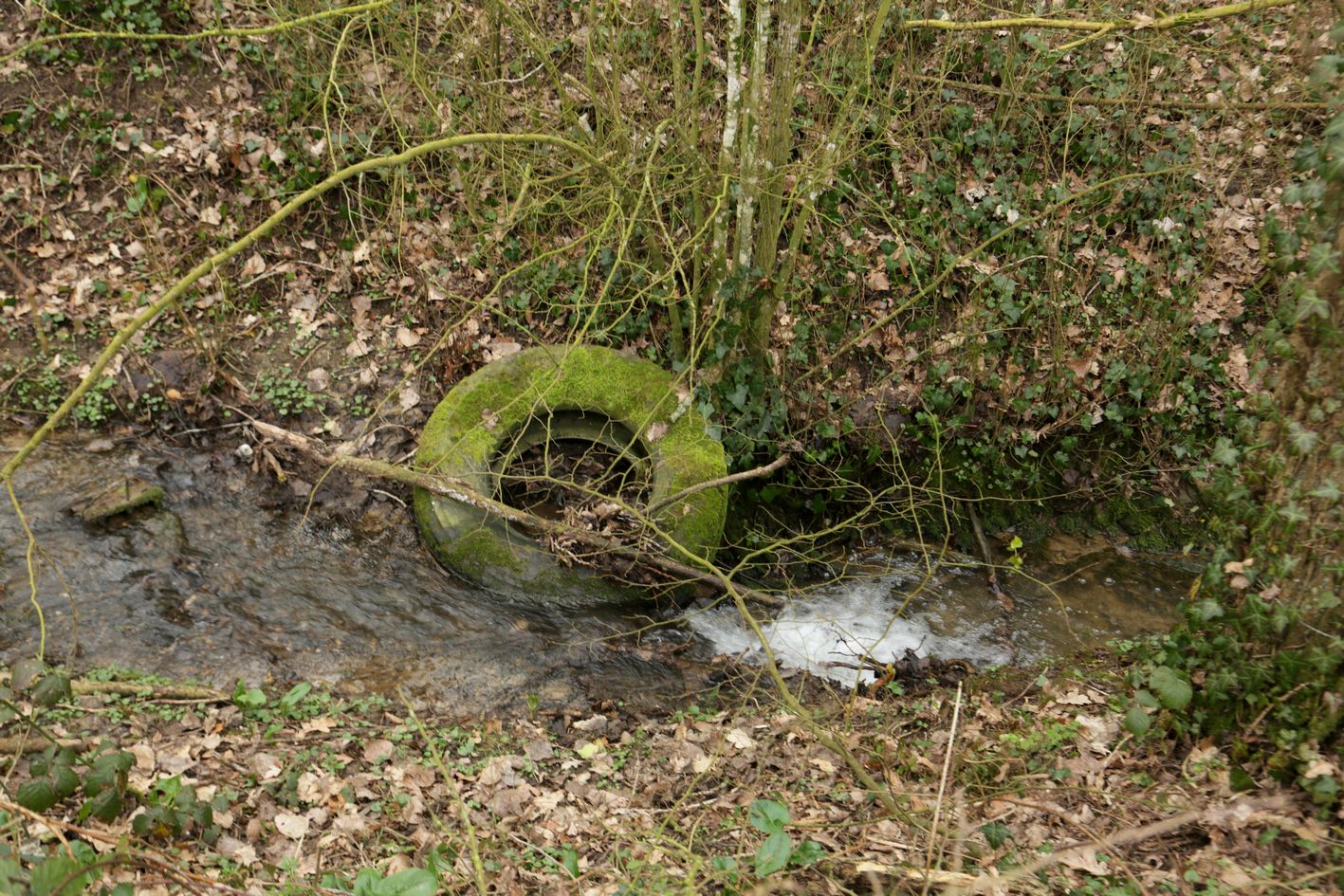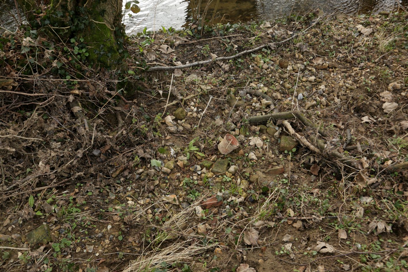 Sur l’autre, rive, remonter un peu le cours d’eau provenant de Febvin-Plafart : longer l’arrière du château, scruter les berges, et revenir sur mes pas, par le bois en longeant un temps le Puits sans Fond : des affaires abandonnées des riverains, vestiges d’une fréquentation révolue, des traces de petits habitants, fort discrètes…