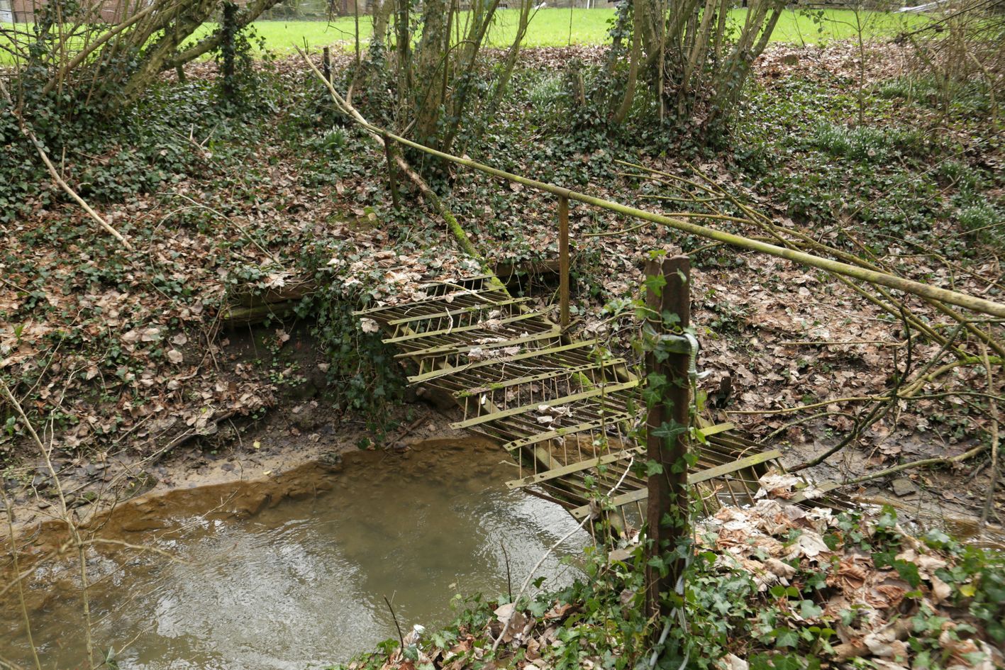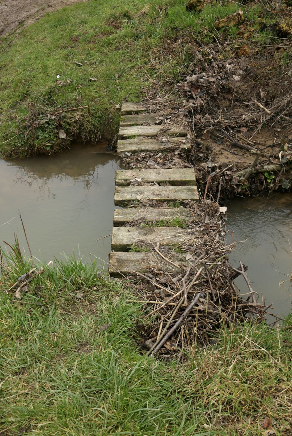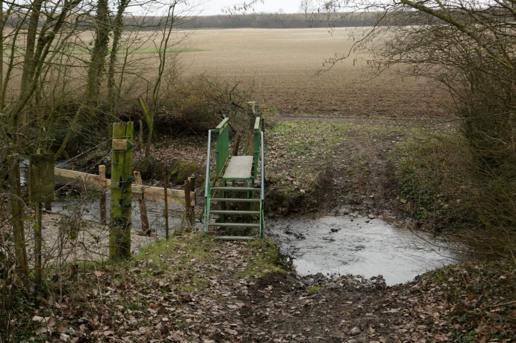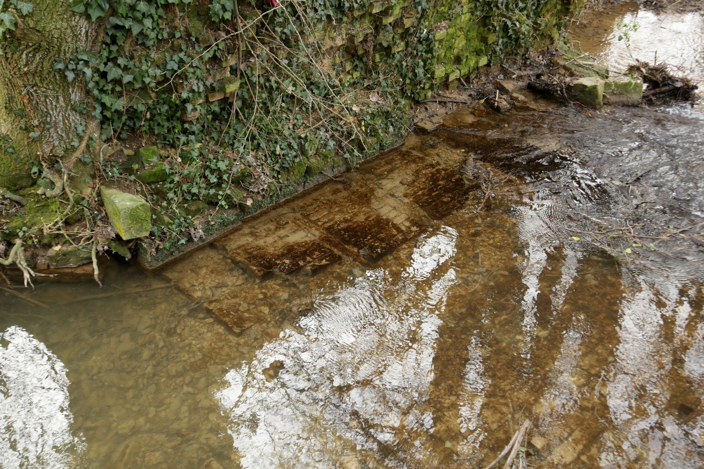 Un peu plus loin, sur la droite, un chemin mène à un gué, le flux vient de la rencontre entre la source du Puits sans Fond et le cours d’eau descendant de Febvin-Palfart. Non loin de la passerelle : pris un morceau de brique…