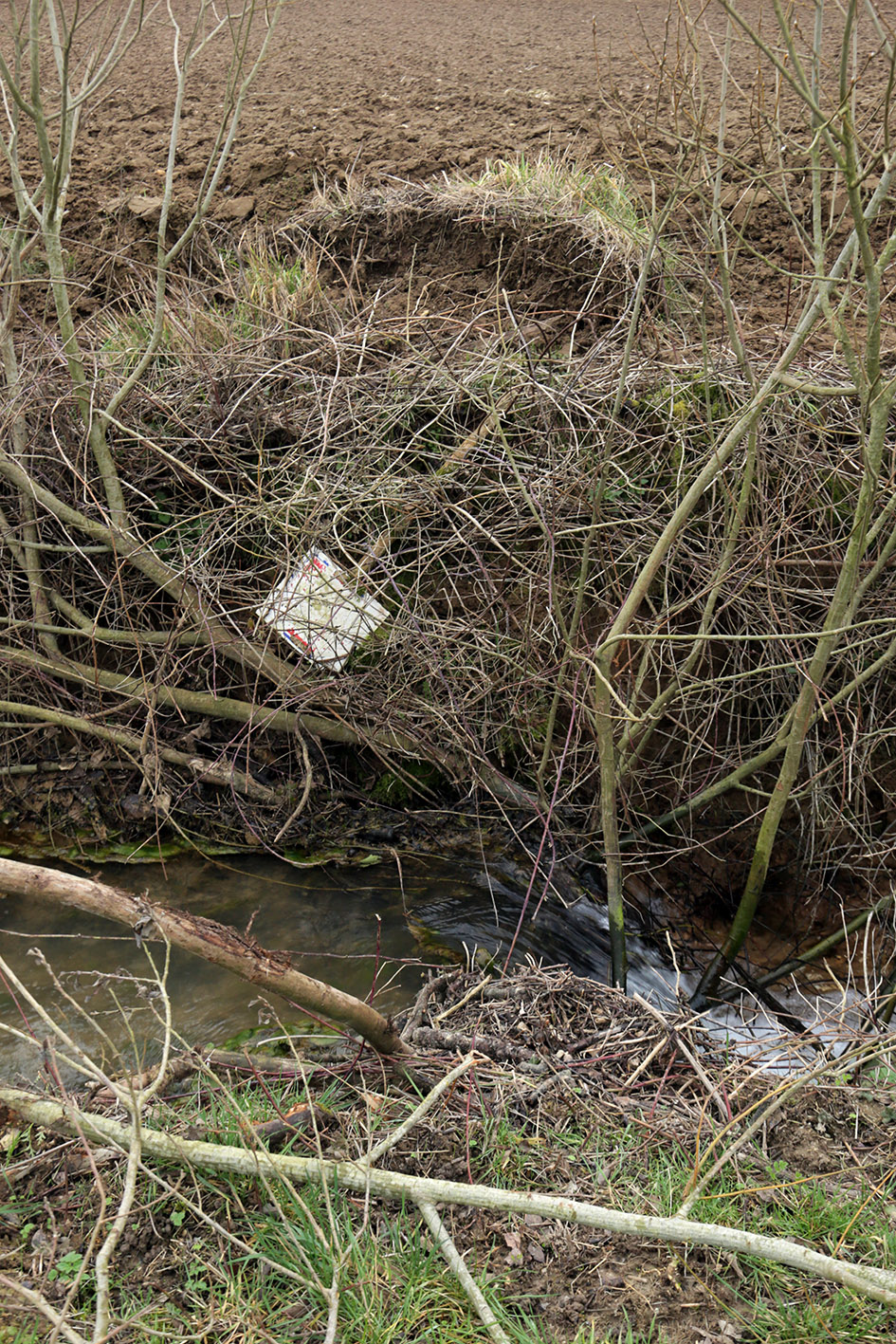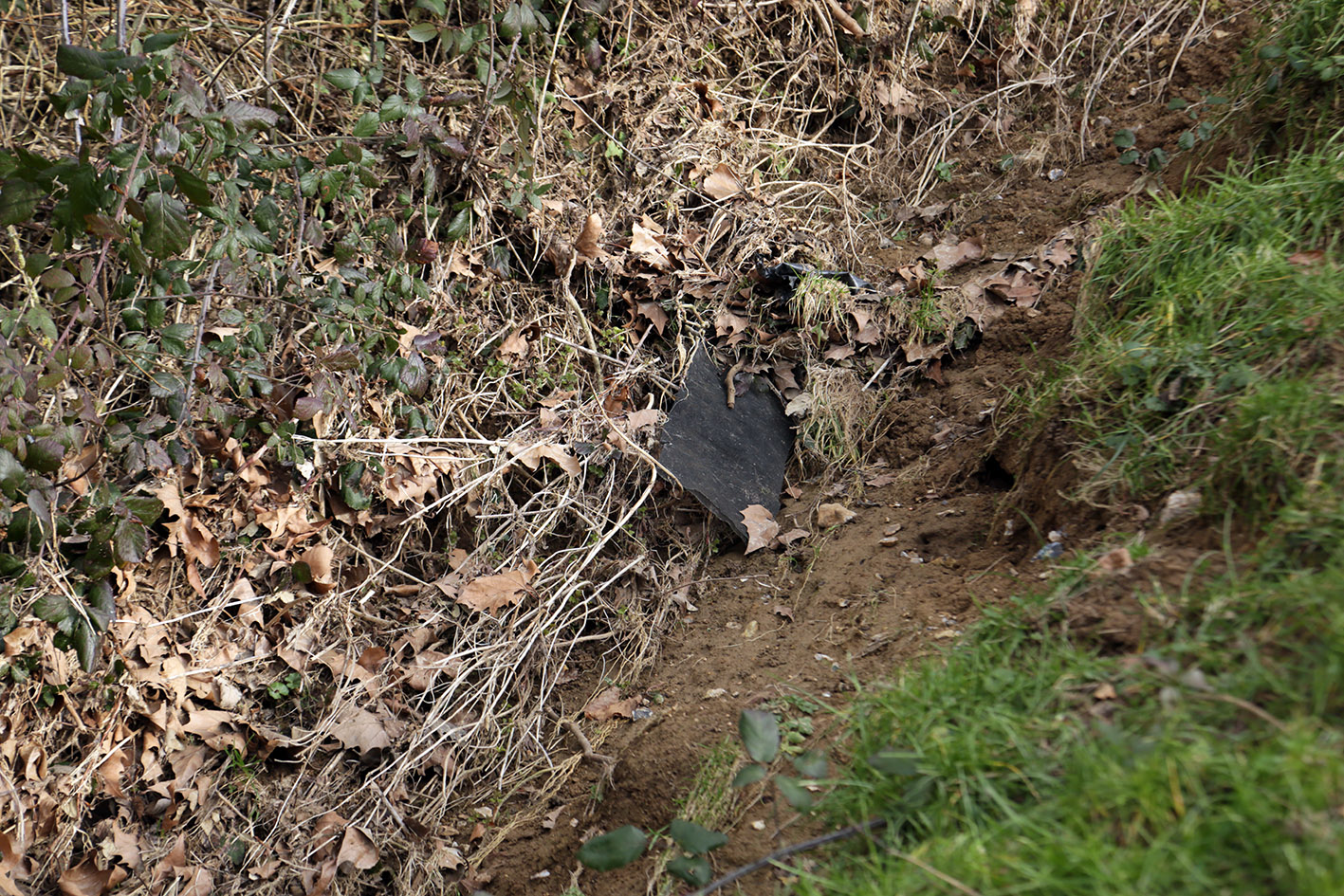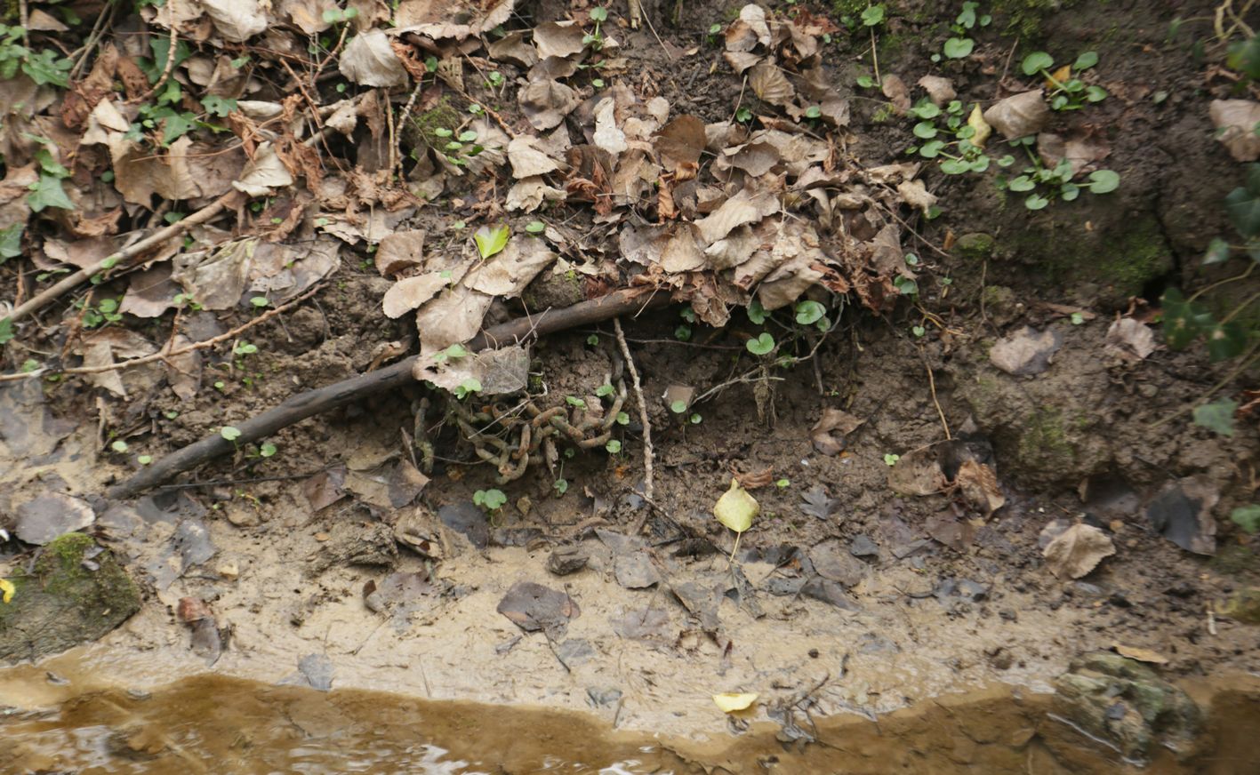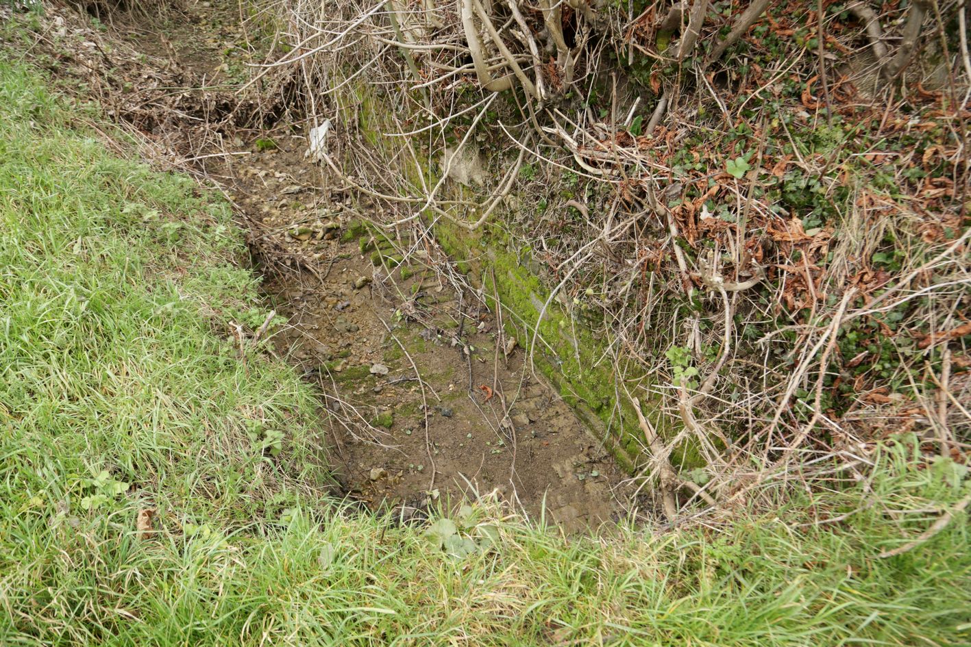 Dans le lit du fossé : prélevé deux petits silex, puis quelques feuilles, des herbes sèches, un bout de plastique bleu et une demi coque de noix.