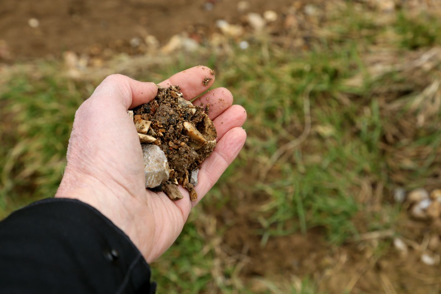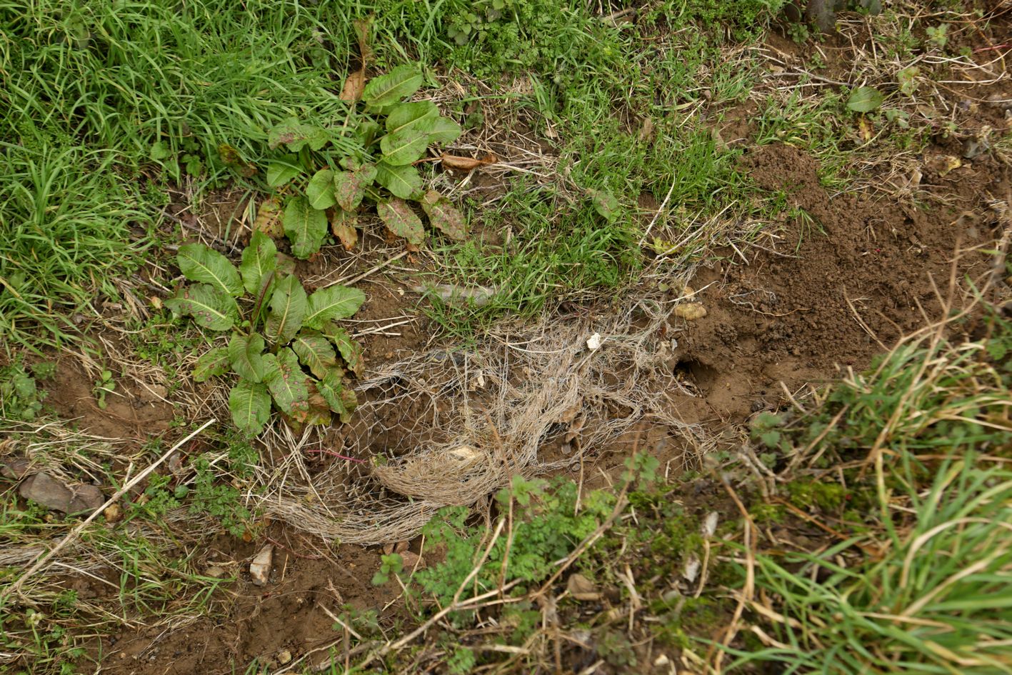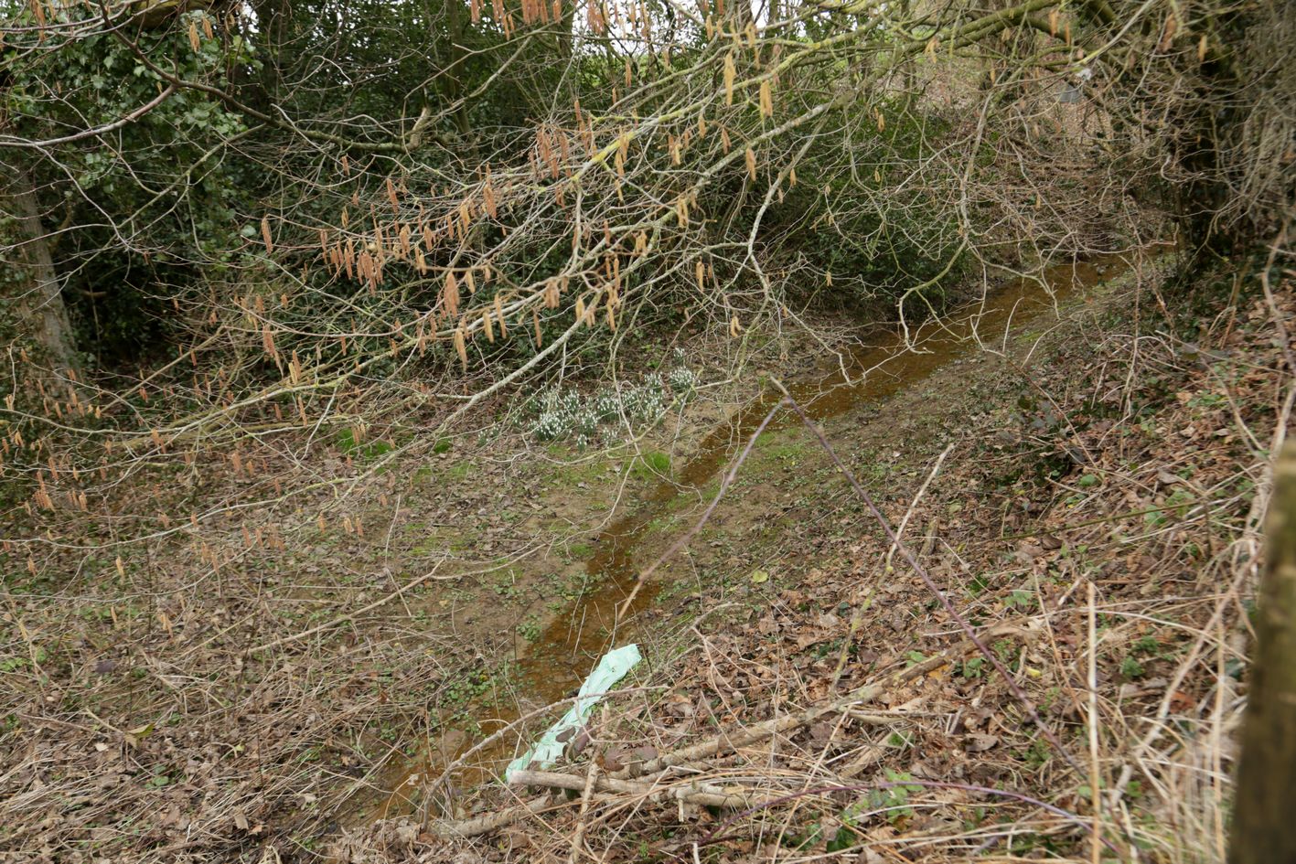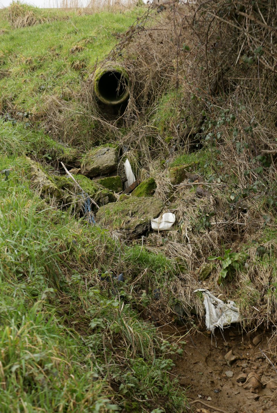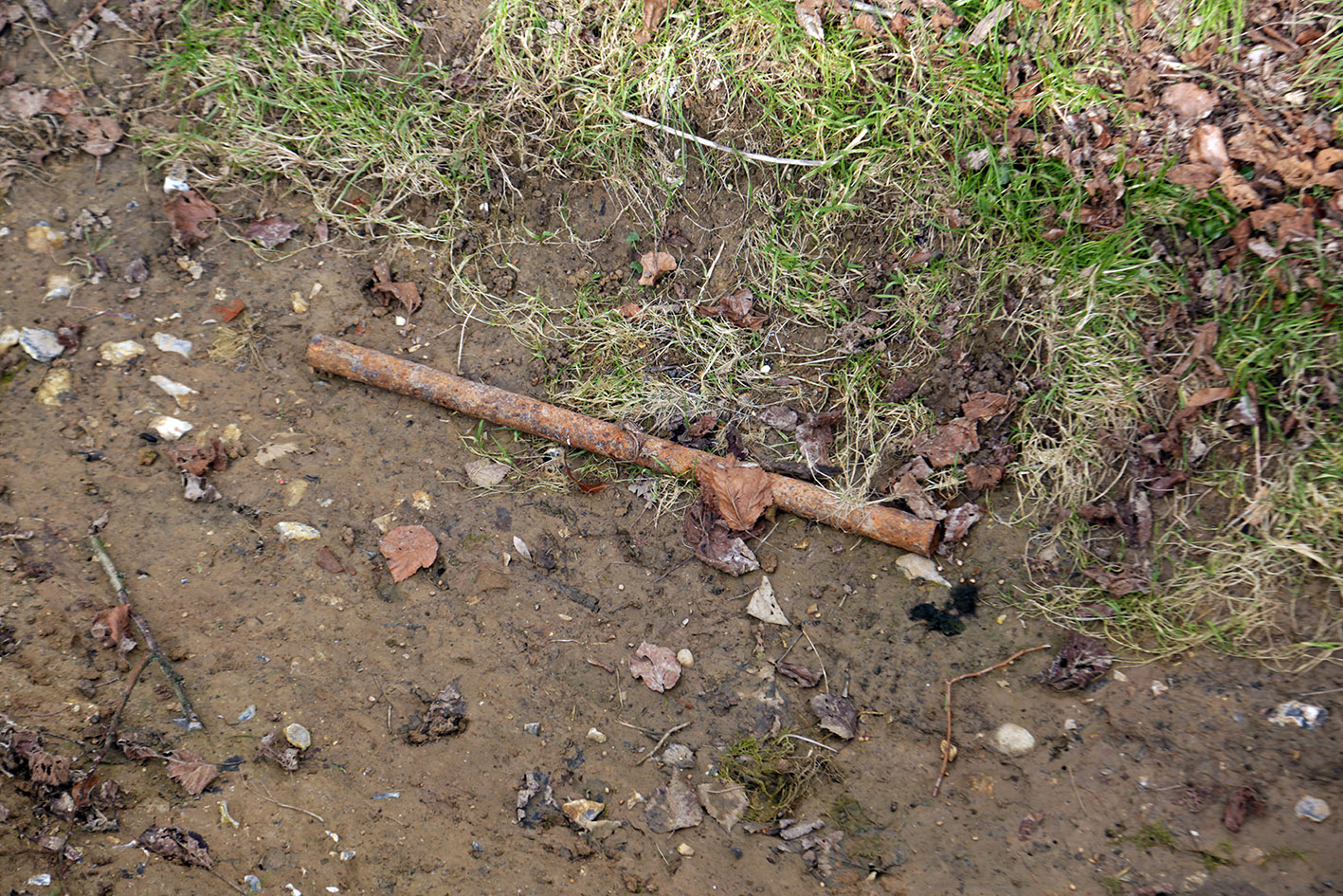 Dans le lit du fossé : prélevé deux petits silex, puis quelques feuilles, des herbes sèches, un bout de plastique bleu et une demi coque de noix.