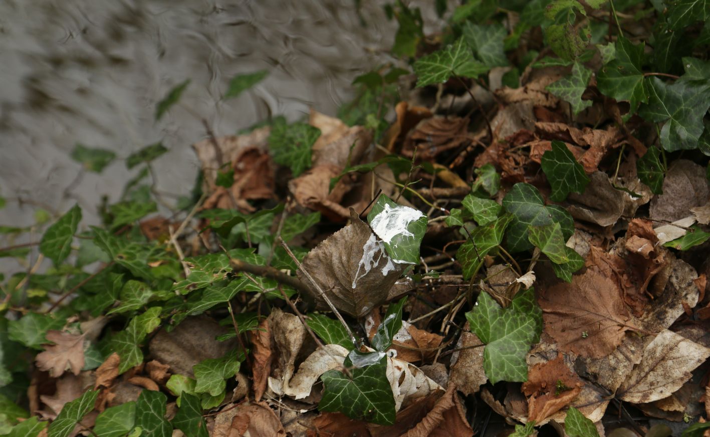 Dans le sens du courant, le pont à Honnighem, près de l’allée du château : un bout de plastique collé à une feuille de peuplier…