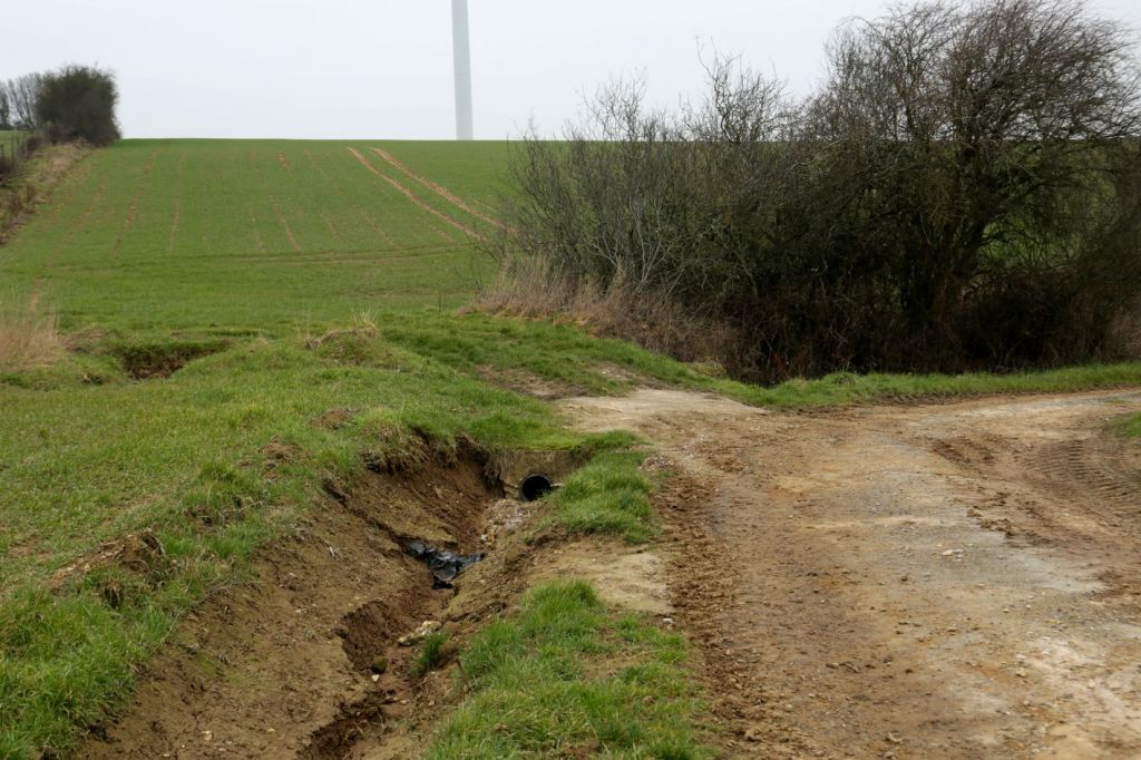Reprise des prélèvements, dimanche 12 février, façon de continuer d’aller à la rencontre des arrivées d’eau dans le bassin : changer de vallée, aller à l’amorce du Truvet, un fossé pluvial, non loin de Beaumetz-lès-Aire. C’est le retour au pays des éoliennes… signe que je suis sur le bord du bassin : pris des graviers.