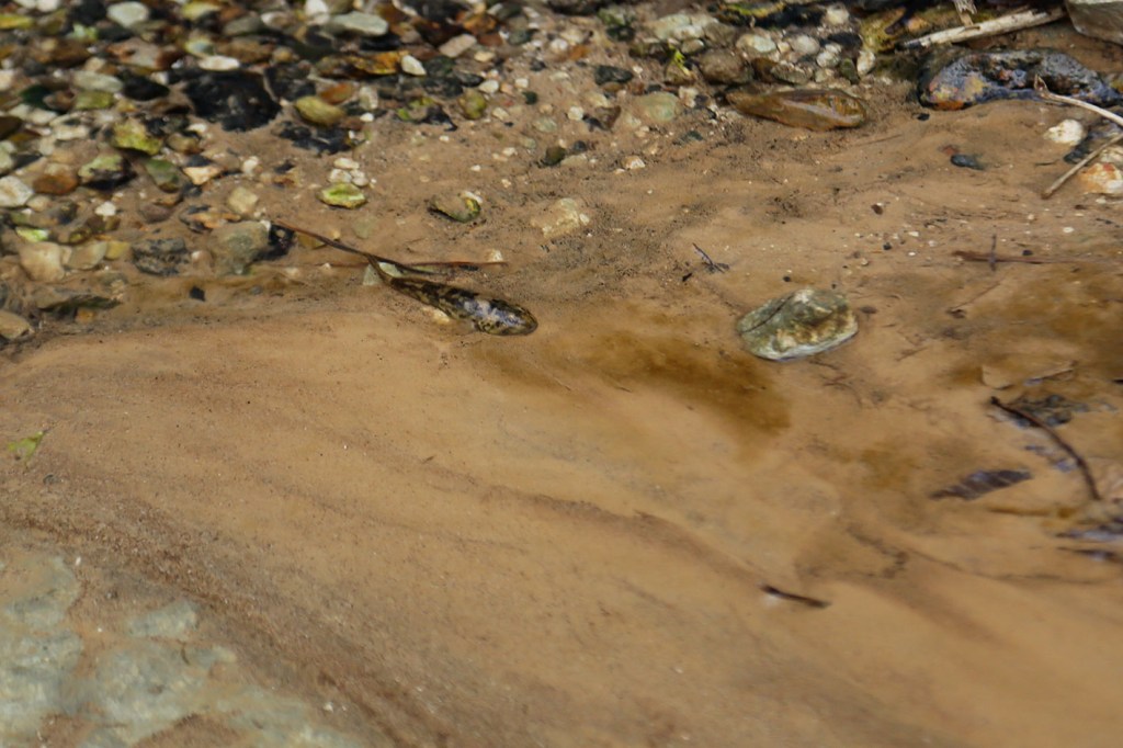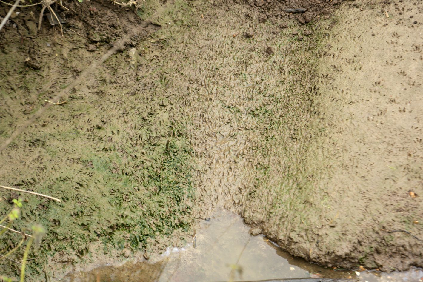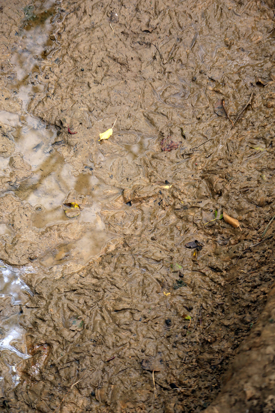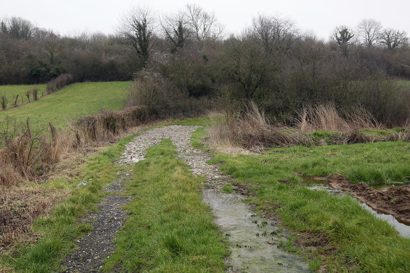 Voilà où passe l’eau de la station de traitement, c’est ténu : un peu d’eau de part et d’autre du creux du chemin couvert de graves, de nombreuses traces de petits rongeurs dans la vase… Intransportable. Mes prélèvements restent subjectifs… Ici rien hormis quelques photos.
