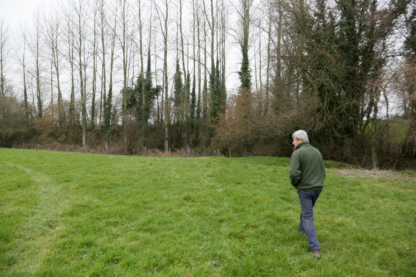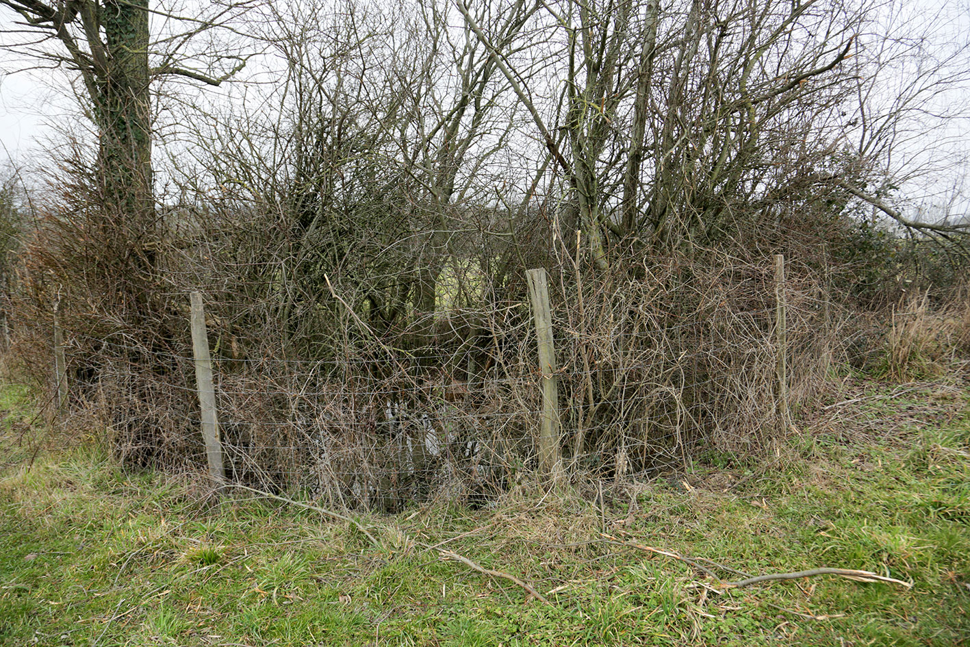Arpenter une prairie, en émerge une couronne buissonnante cerclée d’une clôture : là se trouve la source hivernale ; entre les tiges de la végétation épineuse, j’aperçois le mouvement bouillonnant de l’eau. Paraît qu’à l’été elle est à sec, c’est sa nature. C’est une source temporaire qui émerge d’un trou conique de 3-4 m de profondeur !