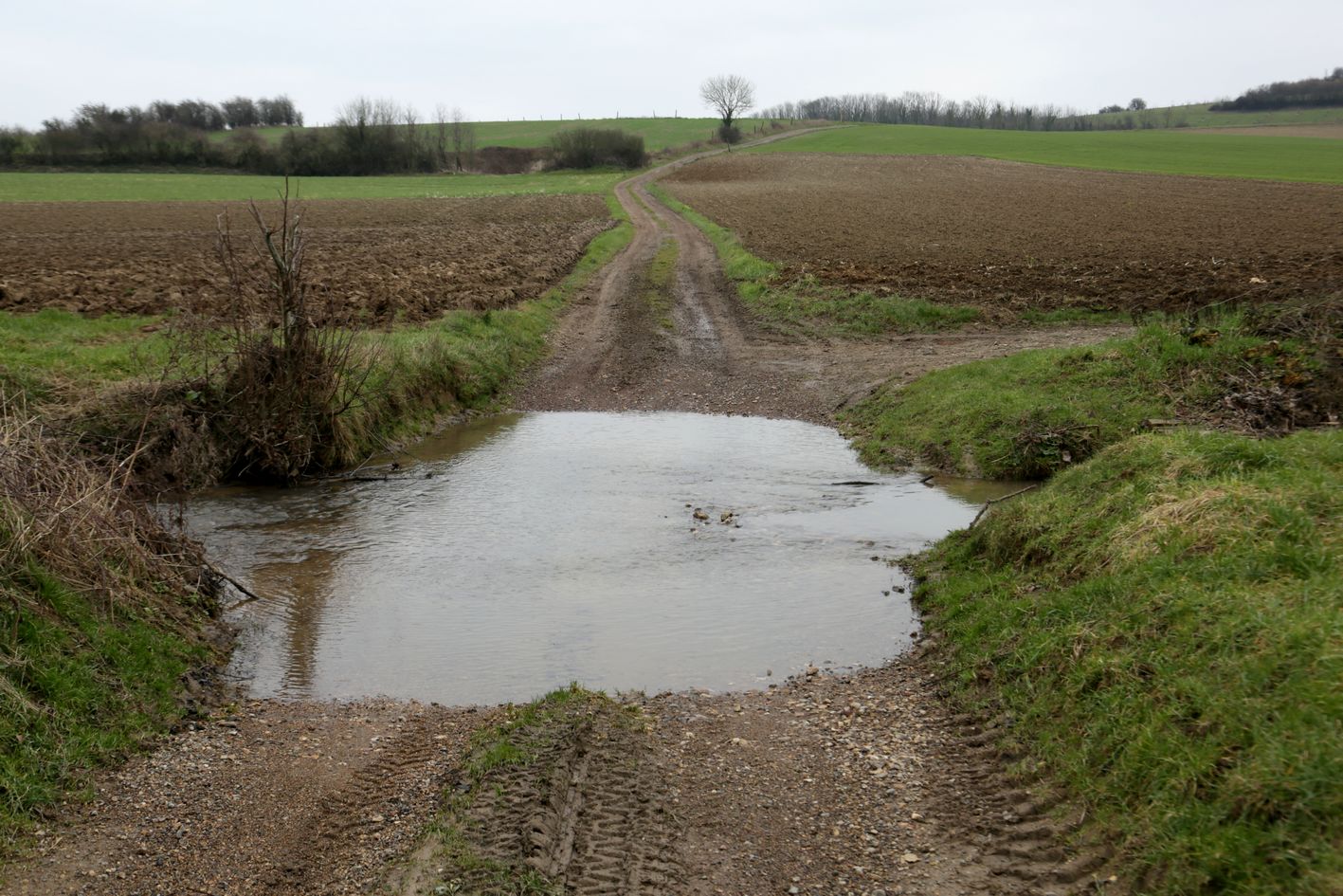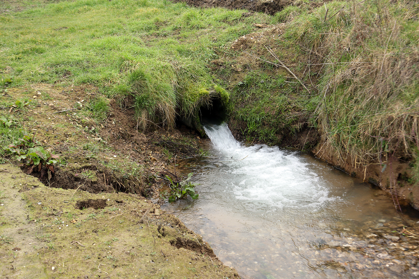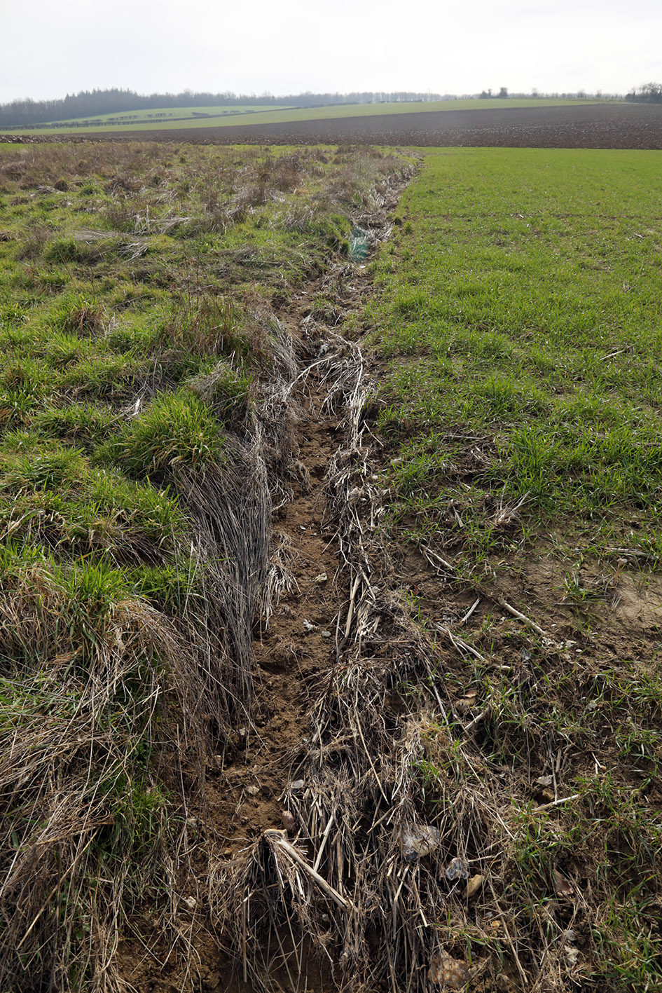 J’en suis arrivé à m’aventurer plus en amont, au sud-ouest, jusqu’à des fossés qui fleurtent avec les limites du bassin. Là où je ne voyais que des creuses sèches insignifiantes, je suis maintenant à même d’appréhender des sources non négligeables, par temps de pluie, surtout lors d’orages, toujours localisés, qui amènent des quantités d’eau importantes en un court laps de temps. L’eau n’a pas le temps d’être absorbée par les terres des champs, elle ruisselle sans entrave, dévalant des fossés, gonflant les ruisseaux et, au bout du compte : la Lacquette…