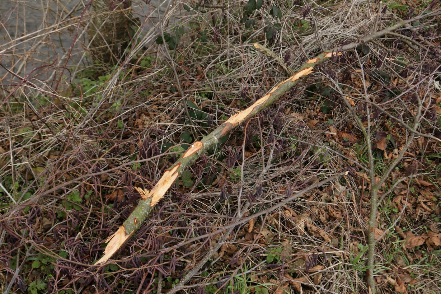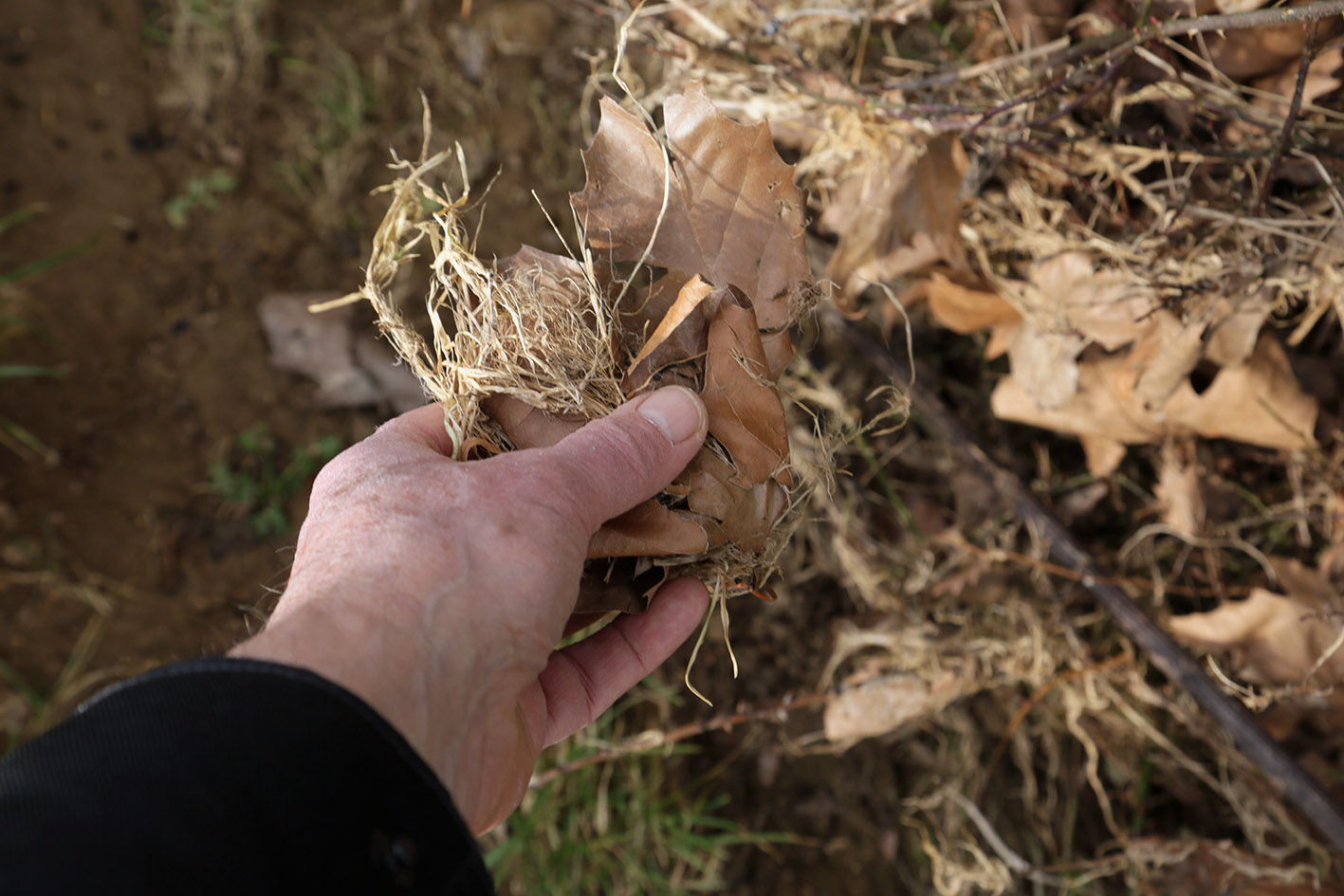 Au centre, les herbes ont été couchées par les passages d’eau, des brindilles ont été emportées et retenues par des tiges, s’amoncelant, j’y prélève quelques emportées de crues.