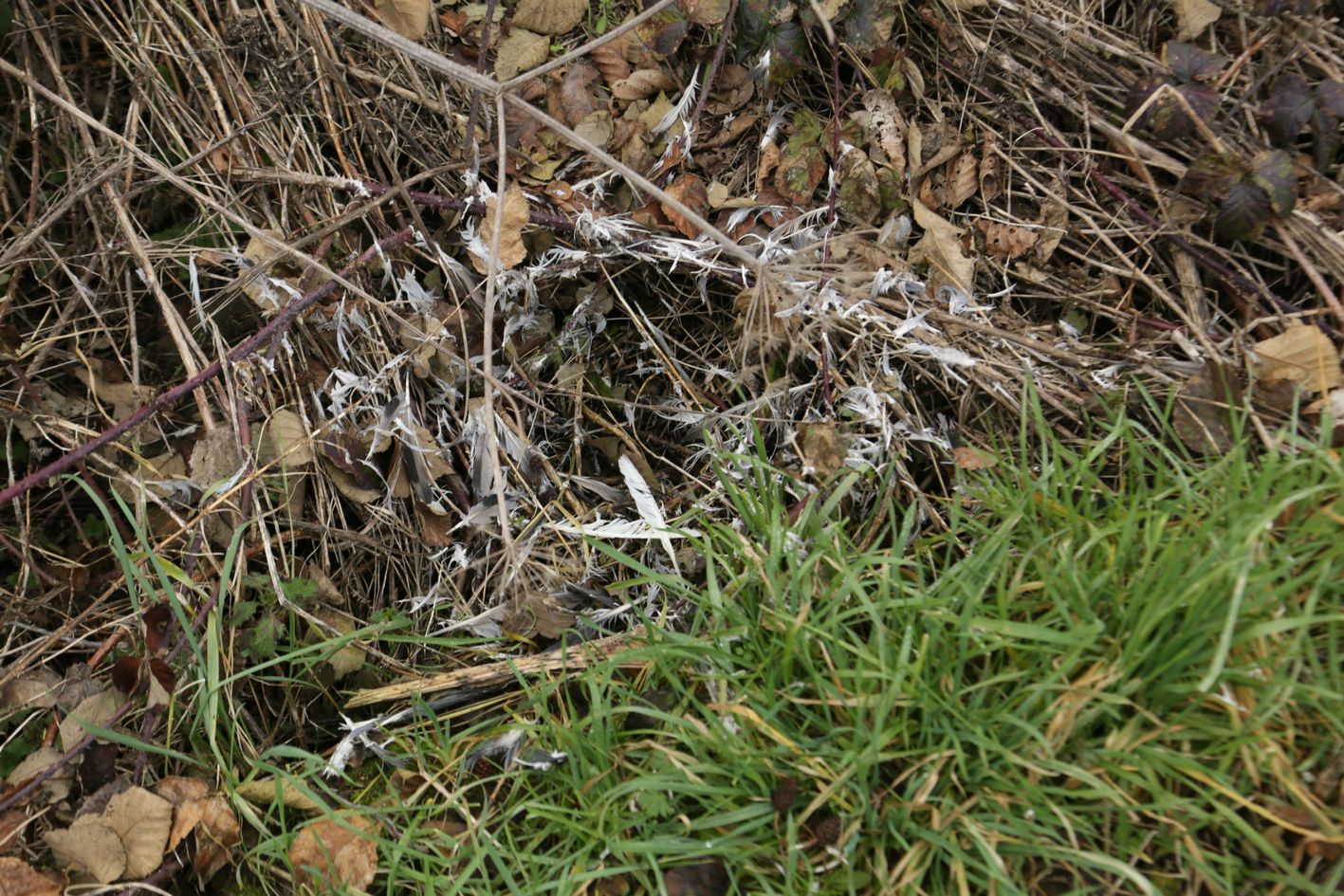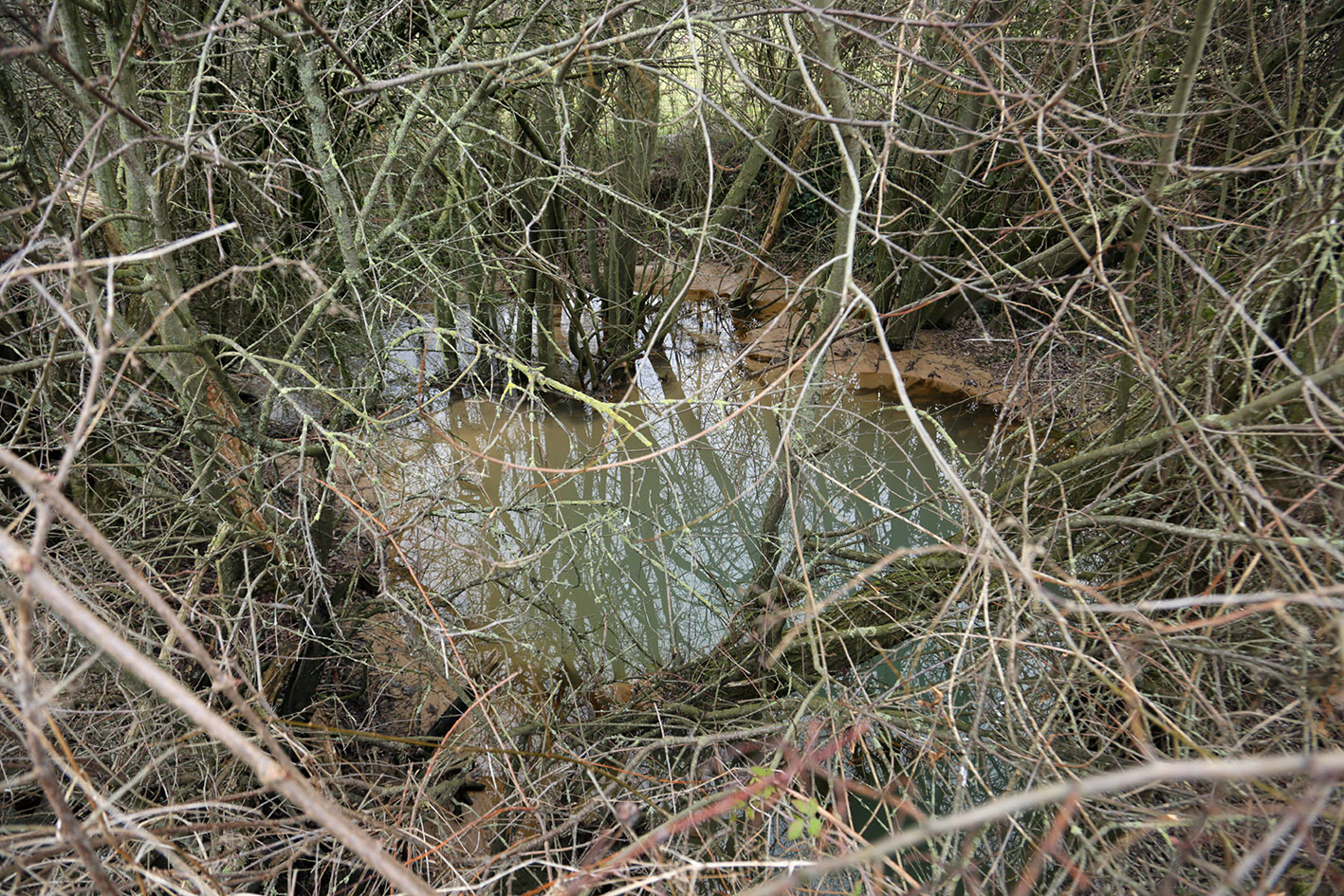 C’est en eau, les tracteurs ont fini par creuser et dessiner une mare, une petite passerelle assure au pédestre le franchissement… Je fouine, observe de part et d’autre les berges, j’y relève des plumes issues d’une prédation, des morceaux de branches déchiquetés par une épareuse : j’embarque !