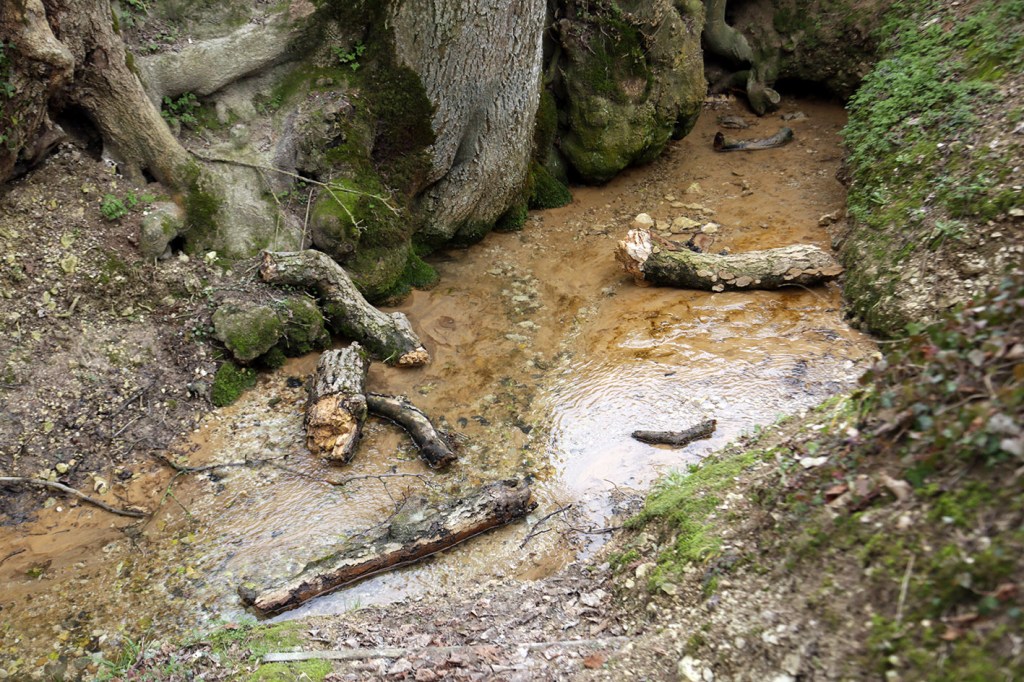 Si l’eau ne doit pas couler souvent ici, elle doit dévaler de façon brutal, elle a tracé son chenal, rongé le sol, mis à nu des cailloux…