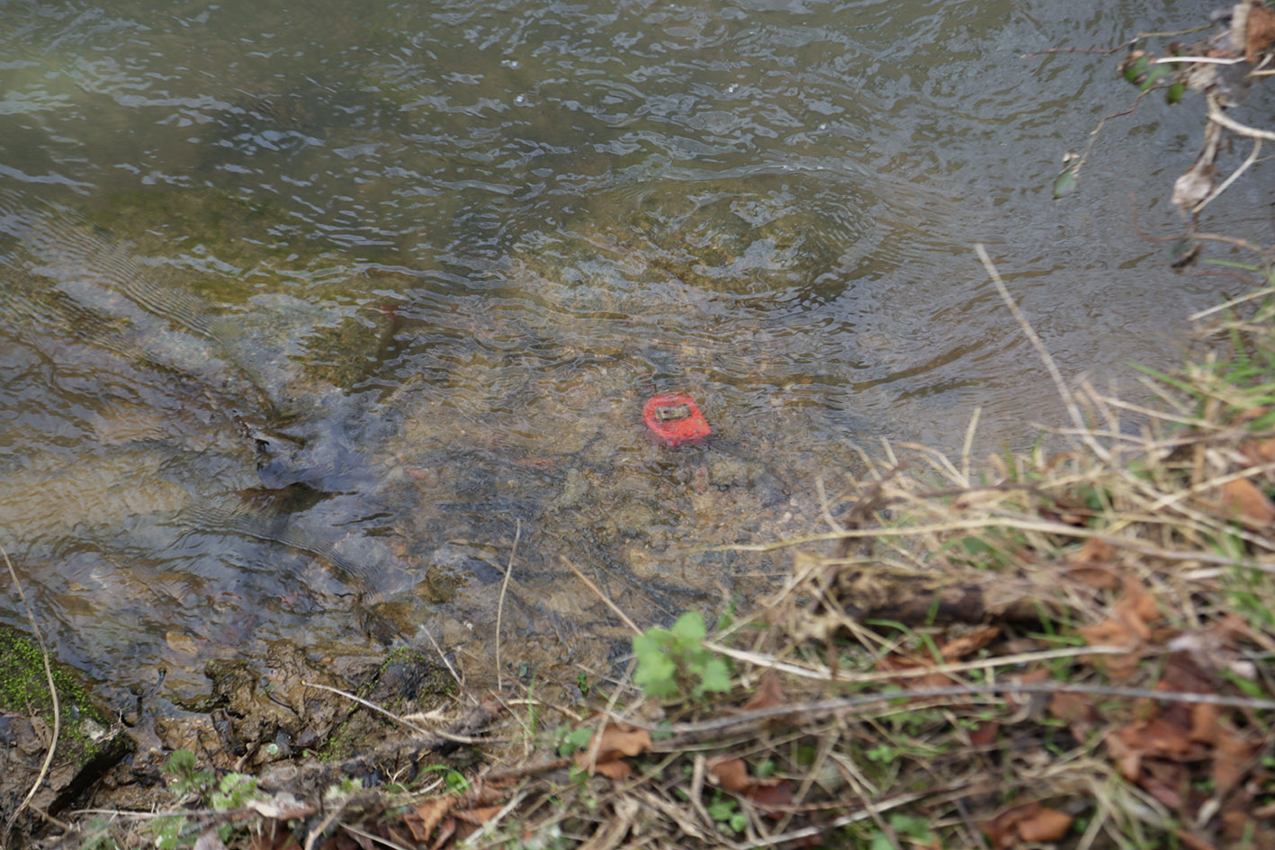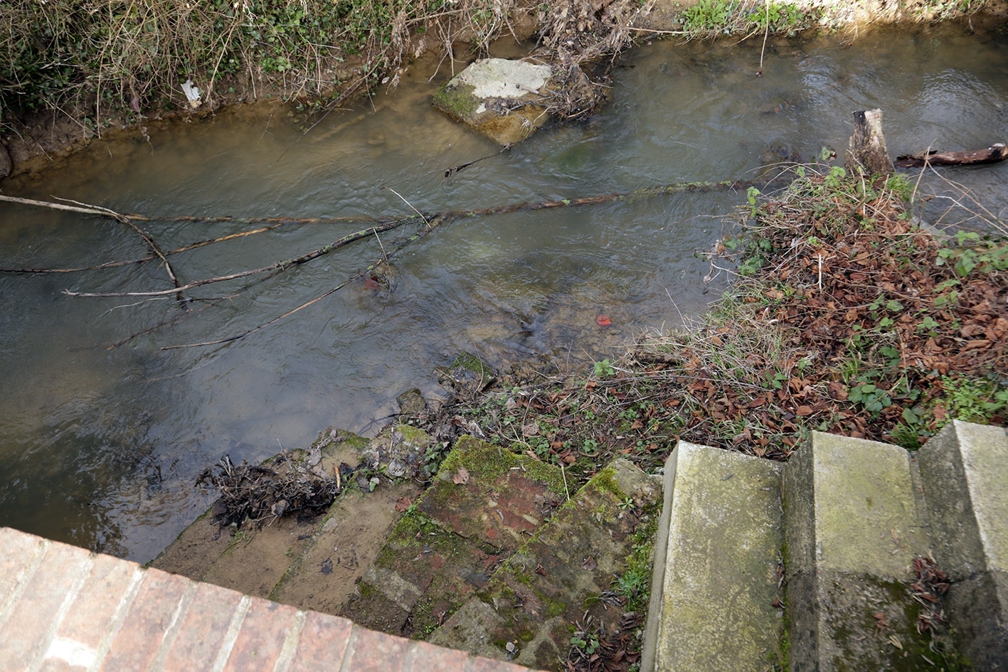 En quittant l’endroit, je cherche un nouvel accès à la rivière ; je finis par trouver, au bout de l’allée du château, par la Grand Rue, le pont qui enjambe la rivière. J’emprunte les marches : quelques feuilles sur le bord et un mètre ruban rouge, bien en vue au fond de l’eau !