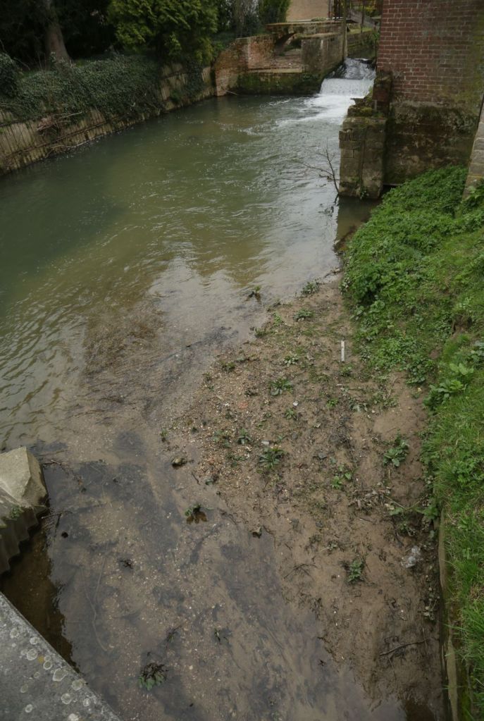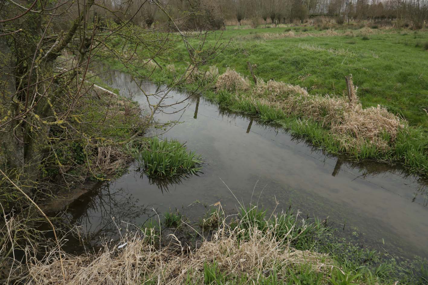 7 mars 2023, pluie : route de Fléchinelle, à l’entrée d’Estrée-Blanche, le Surgeon coule vivement. Sur le site visité en décembre 2022, les restes du débroussaillage et de la taille des arbres.