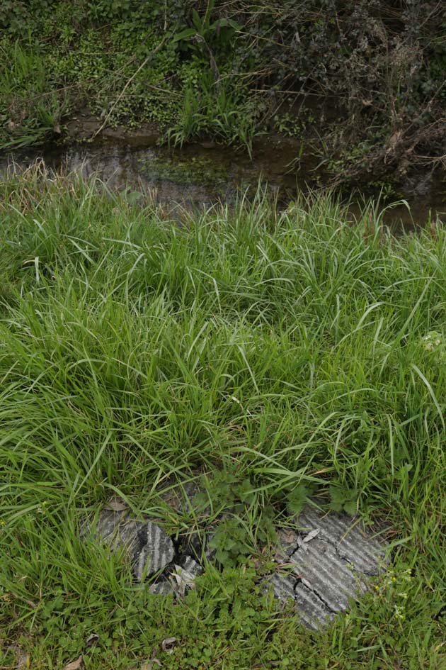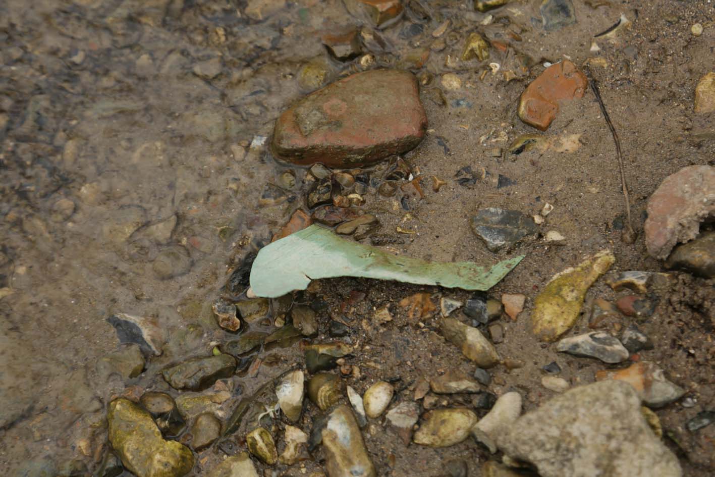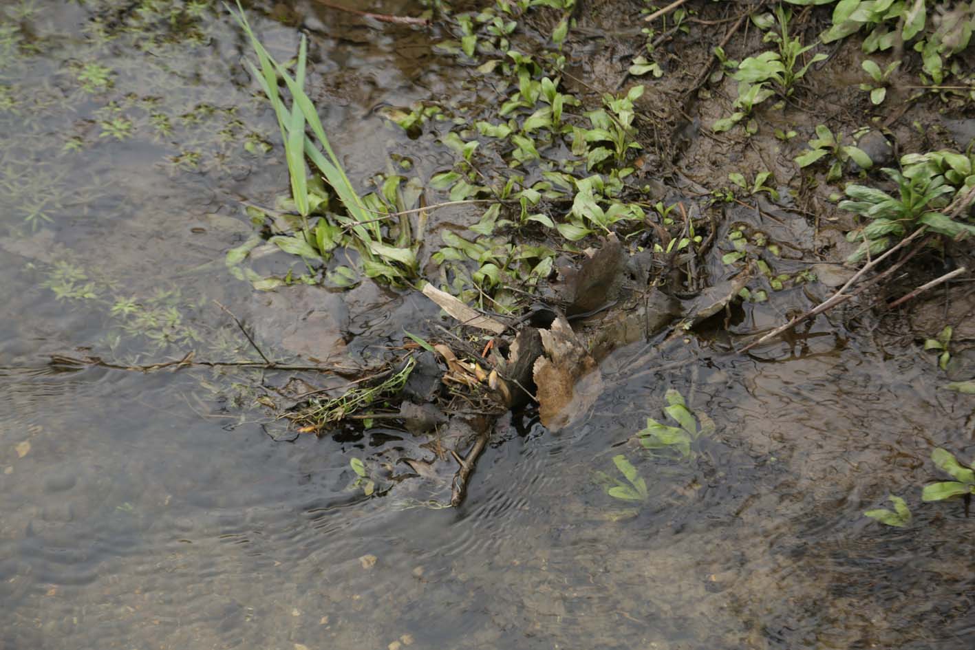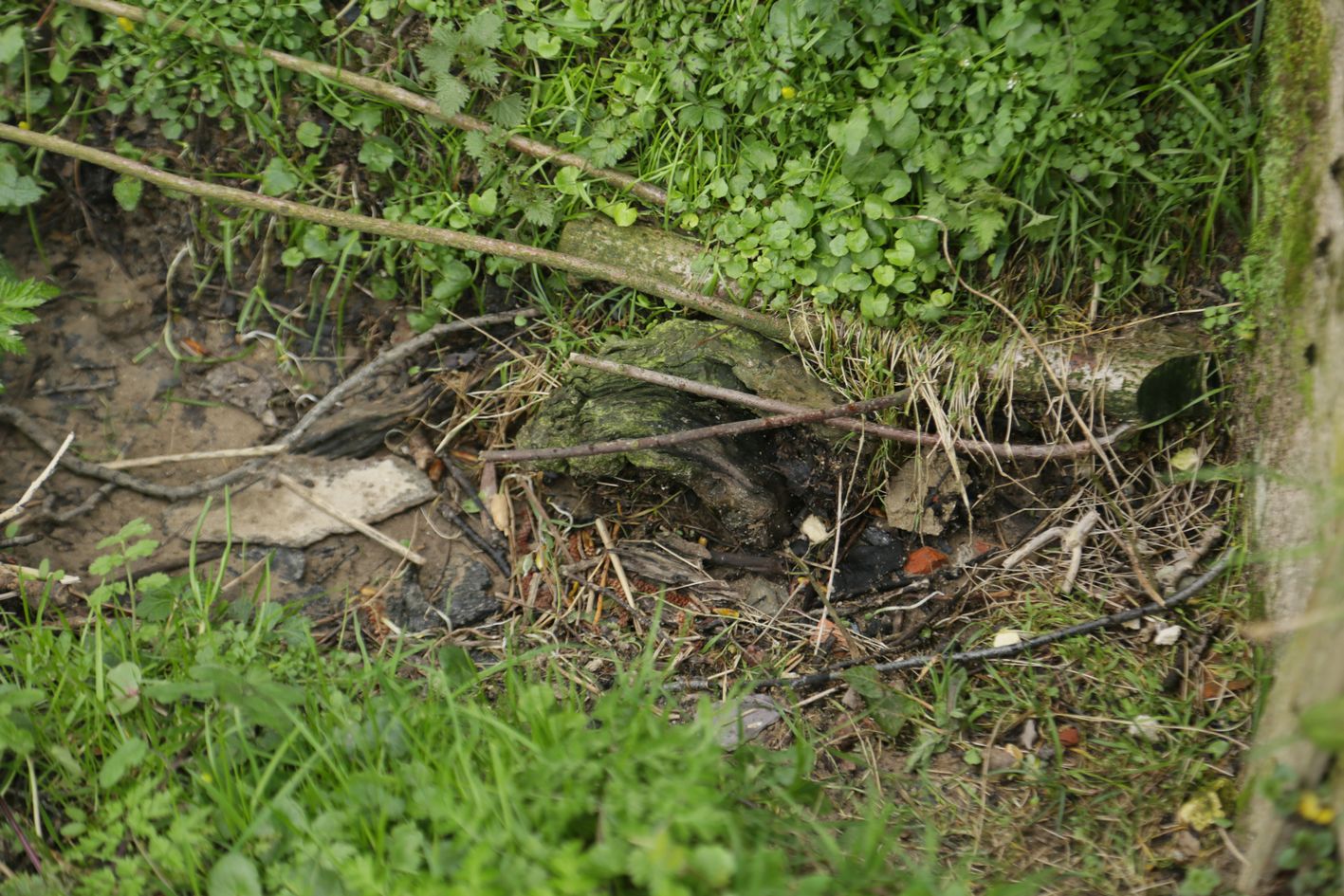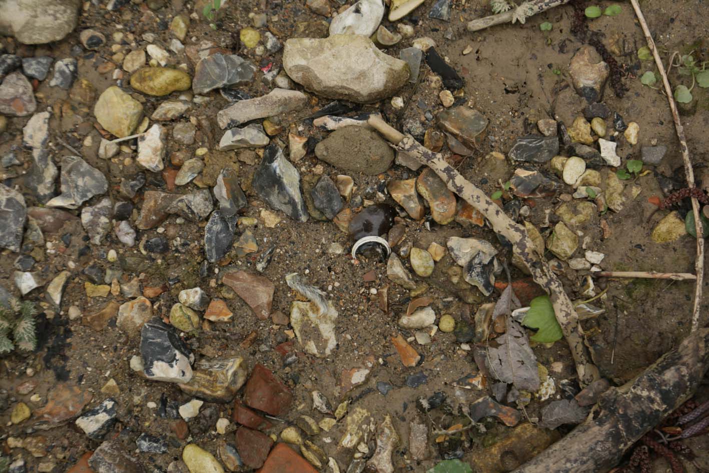 Dans le lit du fossé : prélevé deux petits silex, puis quelques feuilles, des herbes sèches, un bout de plastique bleu et une demi coque de noix.