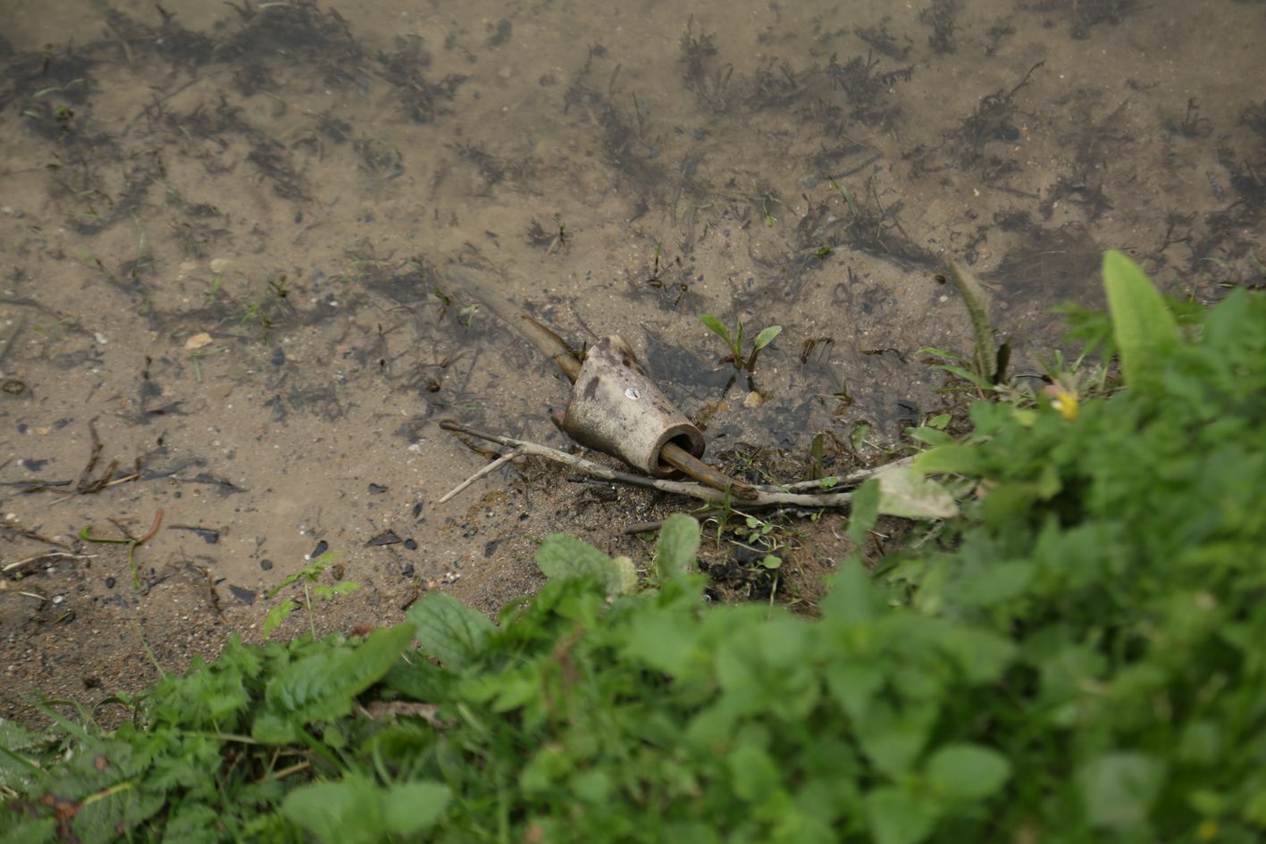 Prélevé 2 morceaux de métal rouillé, bris d’élément de construction, brins d’herbacés agglomérés par l’eau.