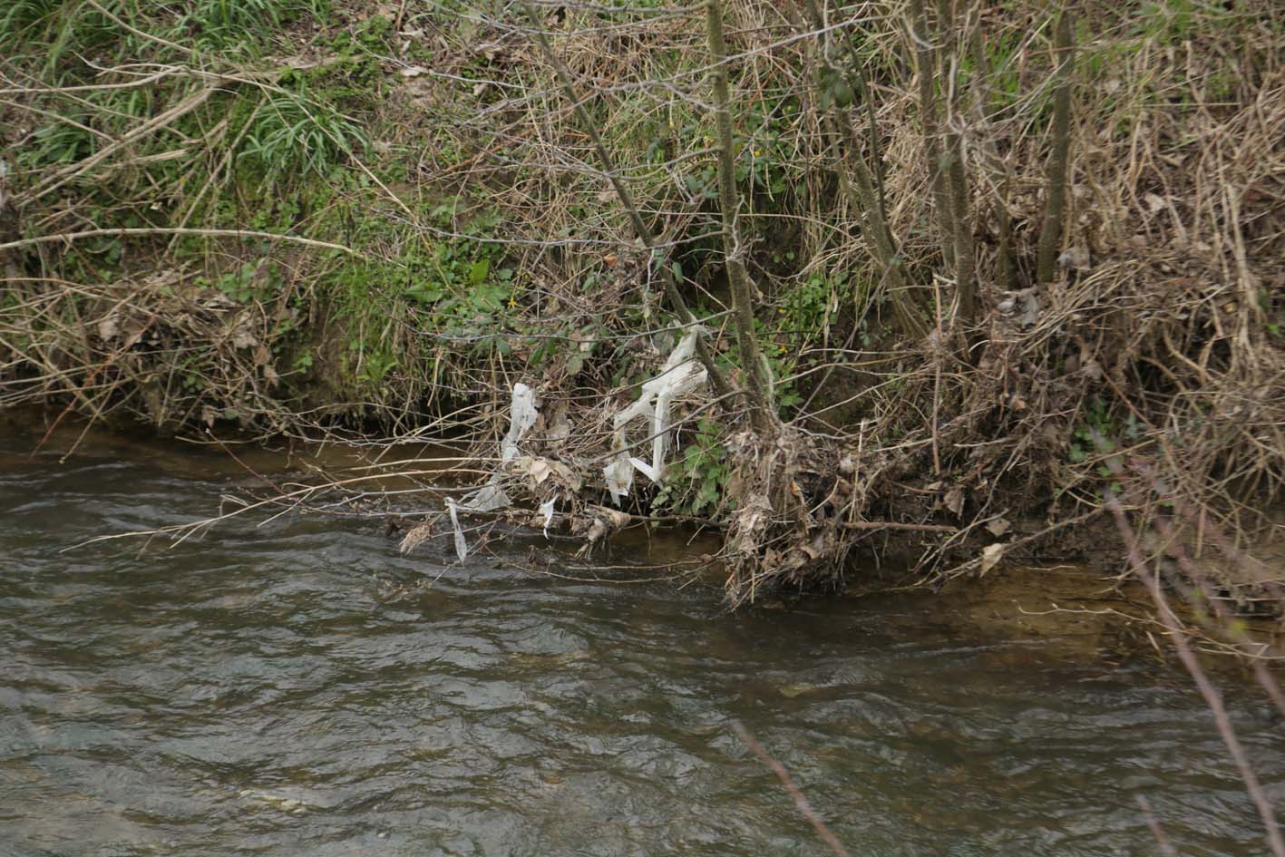Gagner le bord de la Lacquette, longer, photographier et prélever : tiges de plantes dans les branchages, sans doute du gaillet grateron… 2 bouts de plastique, un bout de tige d’apiacée, écorce.