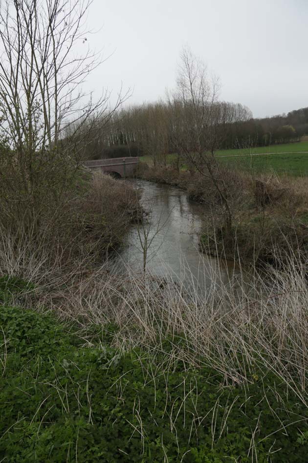 Se déplacer vers Lingy-les-Aire pour remonter la Cavée de Vignacourt. Deux ponts : le fossé arrive, longeant la route et la traversant en direction des champs…