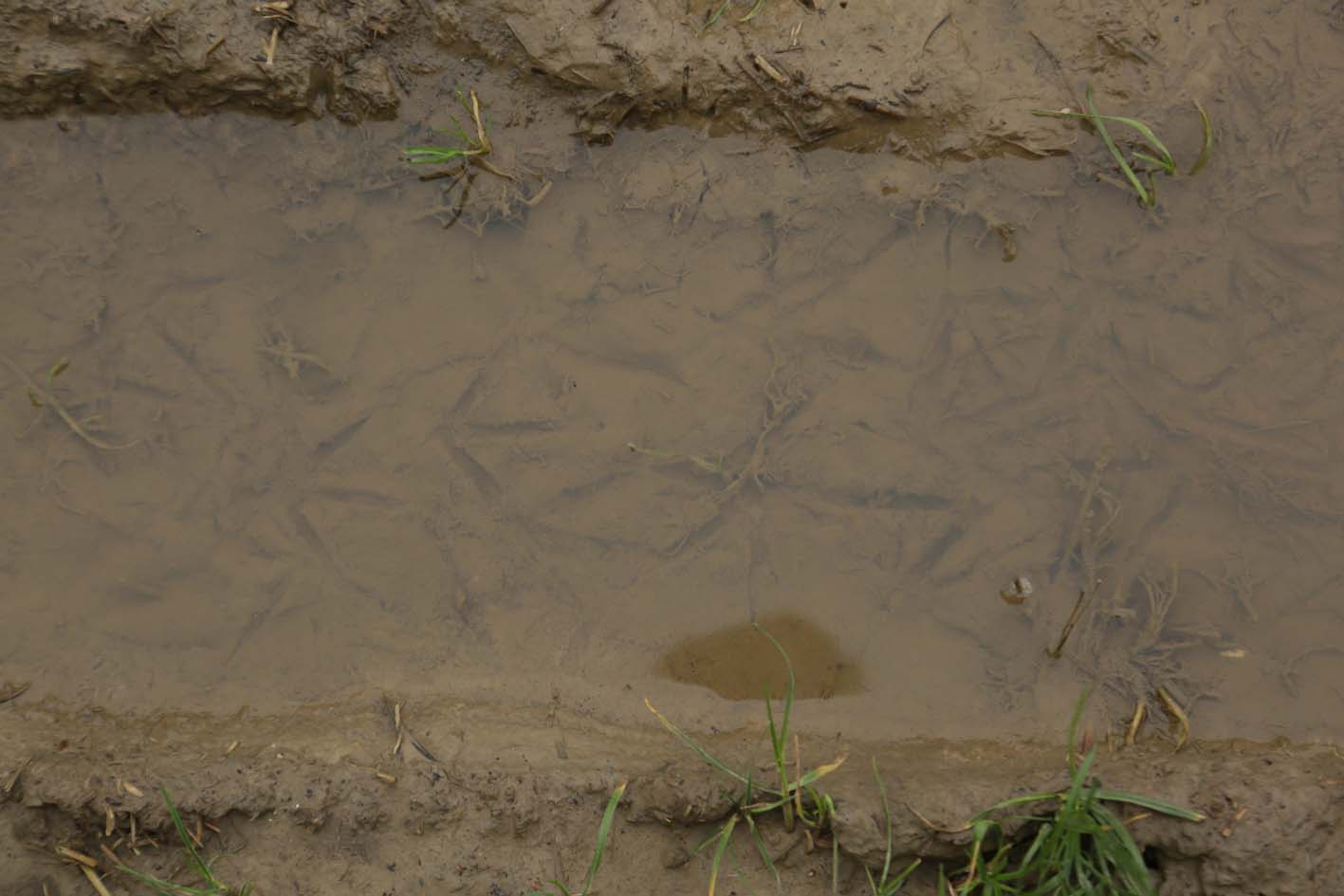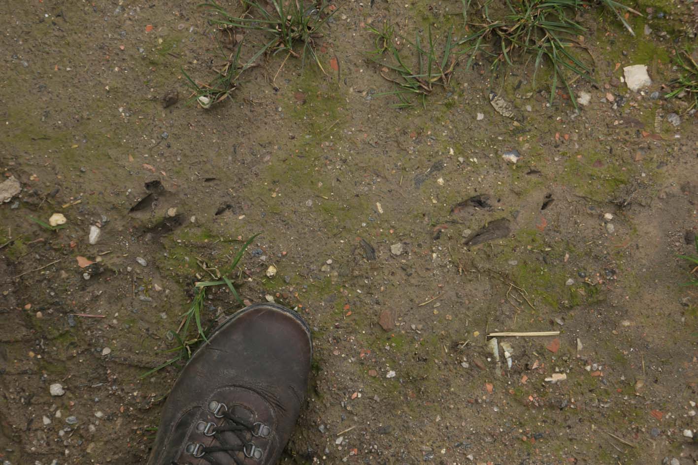 Voilà où passe l’eau de la station de traitement, c’est ténu : un peu d’eau de part et d’autre du creux du chemin couvert de graves, de nombreuses traces de petits rongeurs dans la vase… Intransportable. Mes prélèvements restent subjectifs… Ici rien hormis quelques photos.