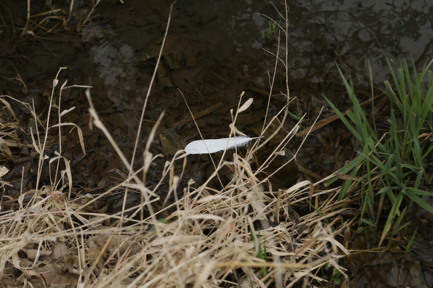 Ai trouvé du « brin », des brindilles charriées par le cours d’eau, en ai ramassé un peu, un duvet d’oiseau, un stylo bille mêlé à la berge, quelques lanières de plastique, sans doute issues d’un sac tissé.
