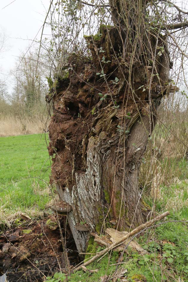 Pas grand chose à cueillir, toutefois, en regardant bien, des matières d’origine végétales comme cet agglutinât de feuilles de saules au pied de l’arbre ; un bâton de sucette me rappelle qu’on est aux abords d’un village ; une demi coque de noix, tiens, encore !… ça commence à m’intriguer.