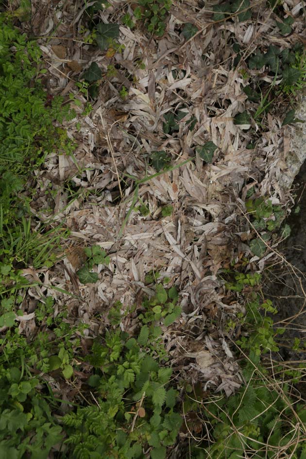 Feuilles, brindilles d’herbacées, bout de bois, plume (pigeon ?), bras de poupée.