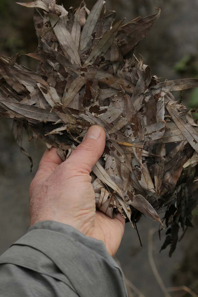Prélevé des feuilles et des racines dénudées par le passage de l’eau.