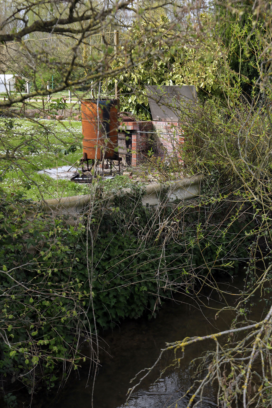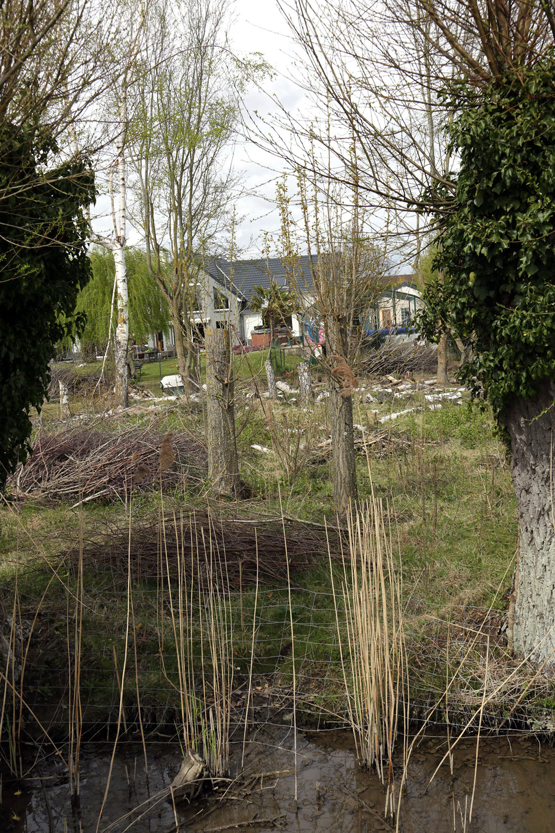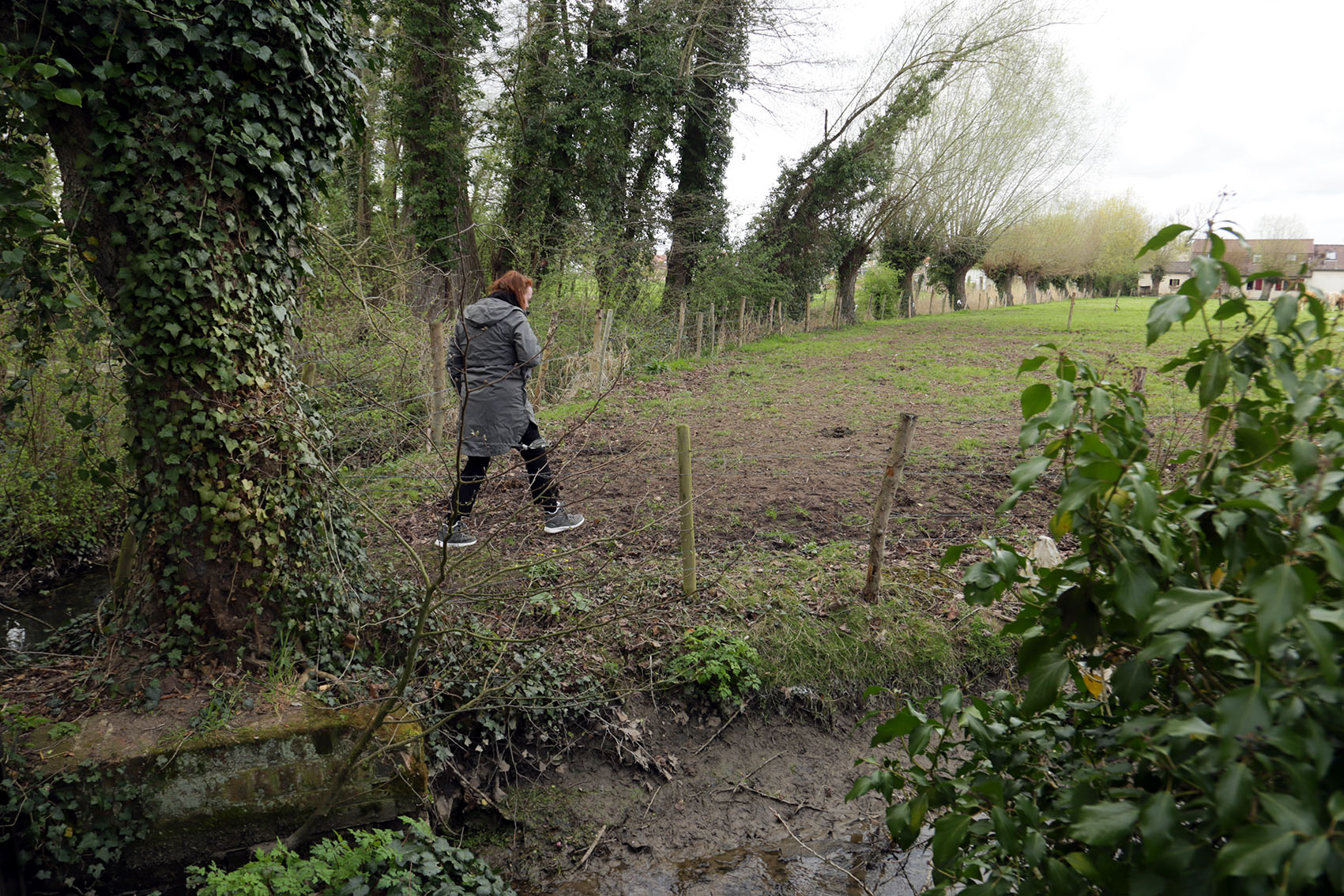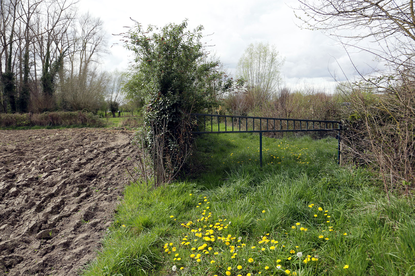 En attendant, sur notre droite, de l’autre côté du fossé, à nouveau, des propriétés : des fonds de jardin, avec porte d’accès à l’eau… des emplacements de pompes ; l’une d’elle est en place. Aucun doute, sont là pour alimenter les jardins…
