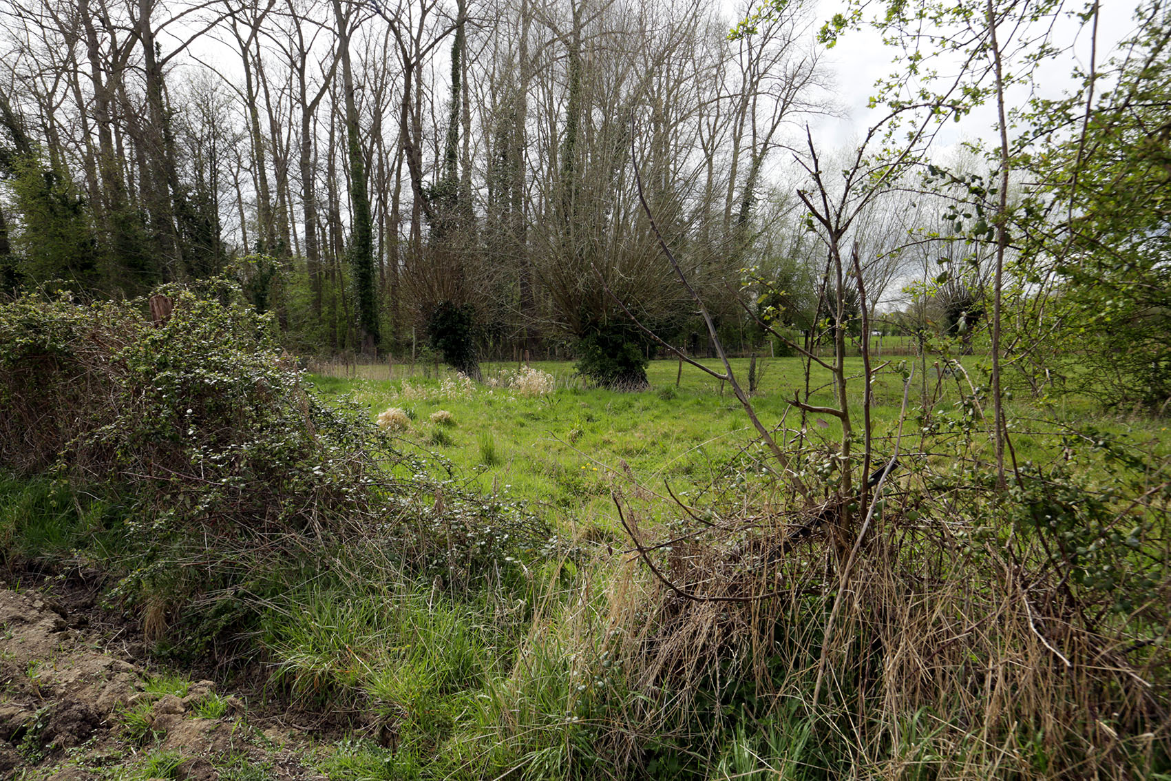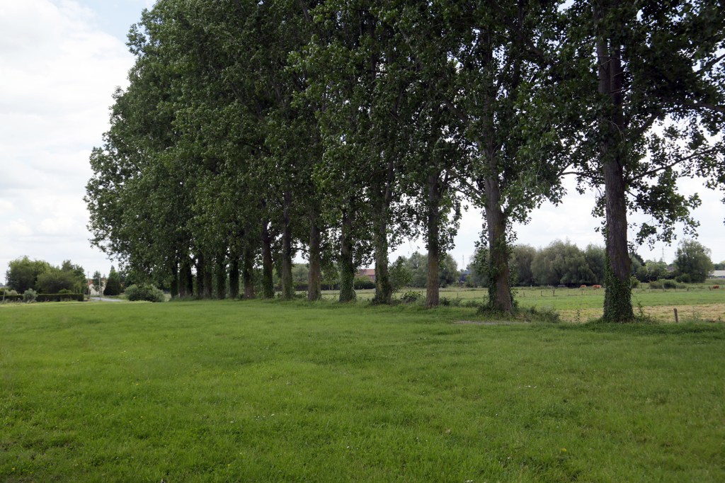 A droite, le terrain de tir à l’arc : j’aperçois une ligne nette de peupliers, un indicateur ; je veux aller voir si je peux y trouver le fossé de dérivation de la Laque.