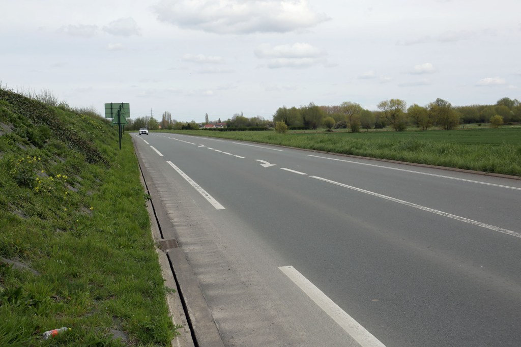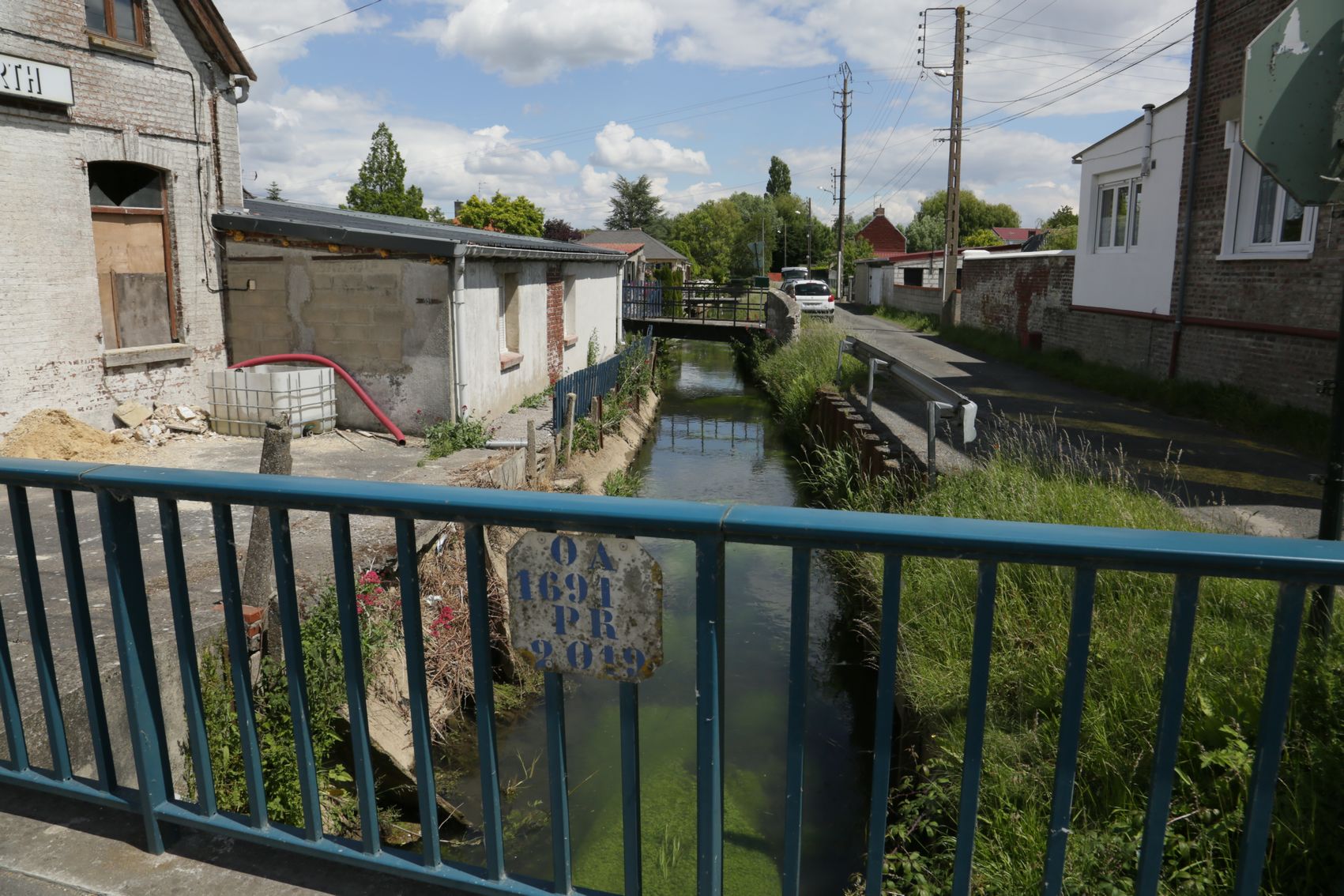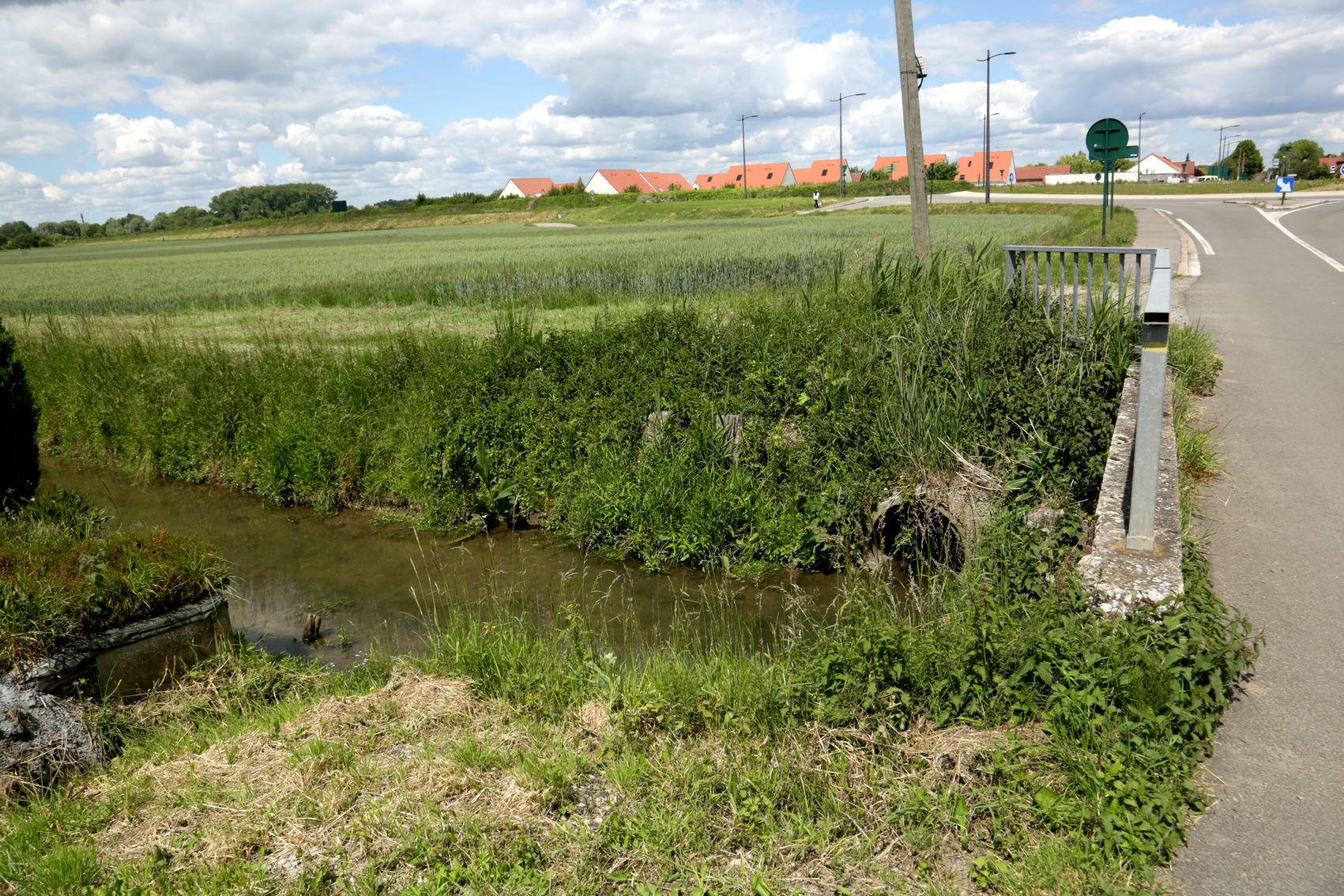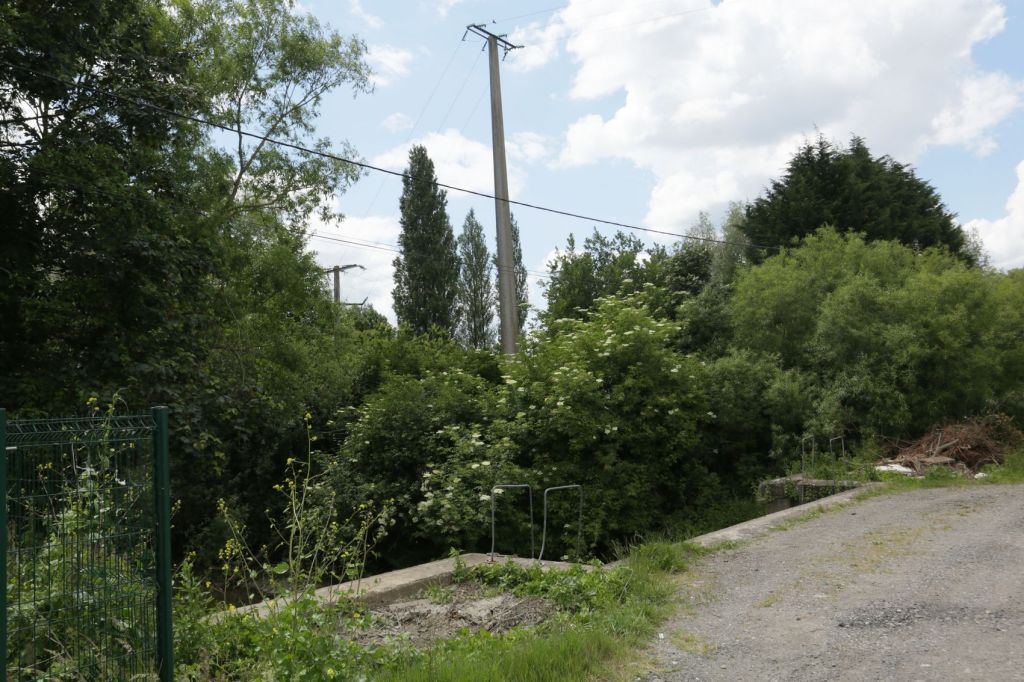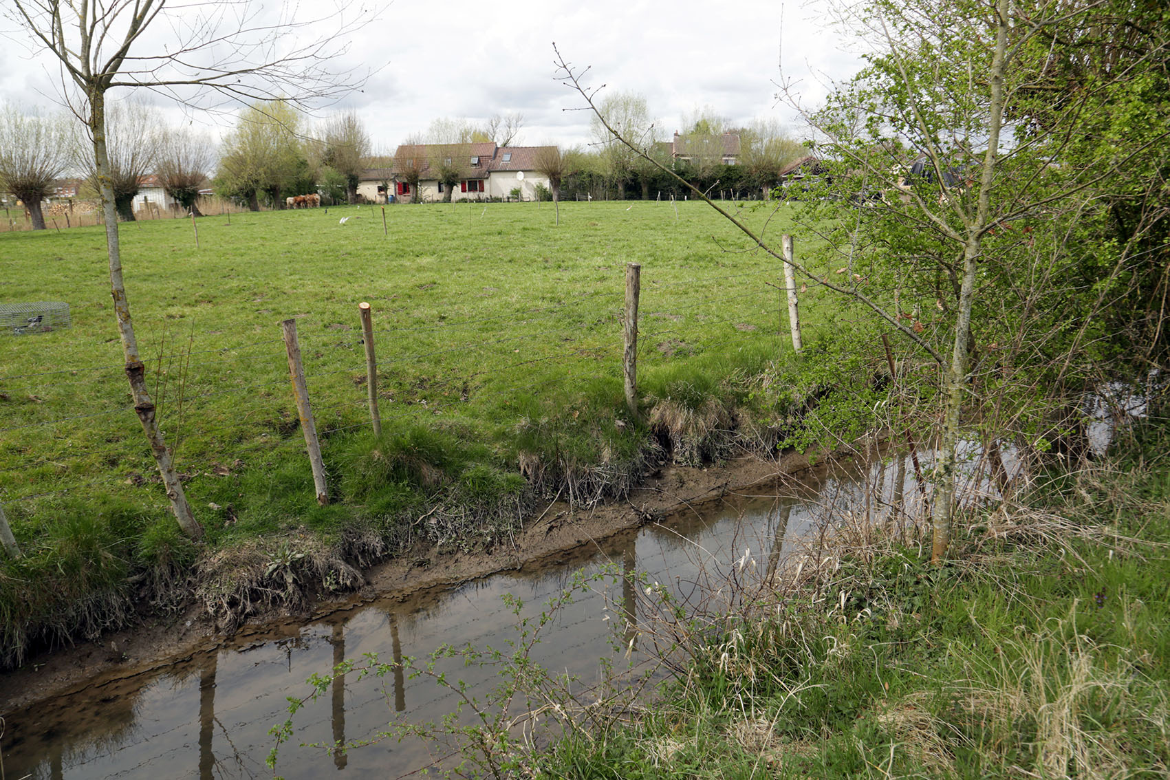 Comme je l’avais noté sur la carte, l’eau doit passer sous le merlon qui longe la contournante qui mène vers Isbergues, sera pas possible de continuer à suivre la dérivation…