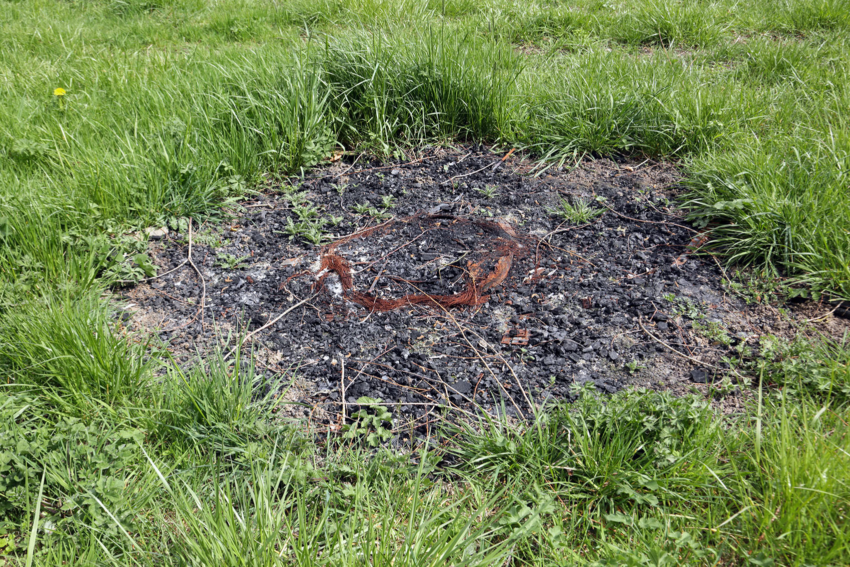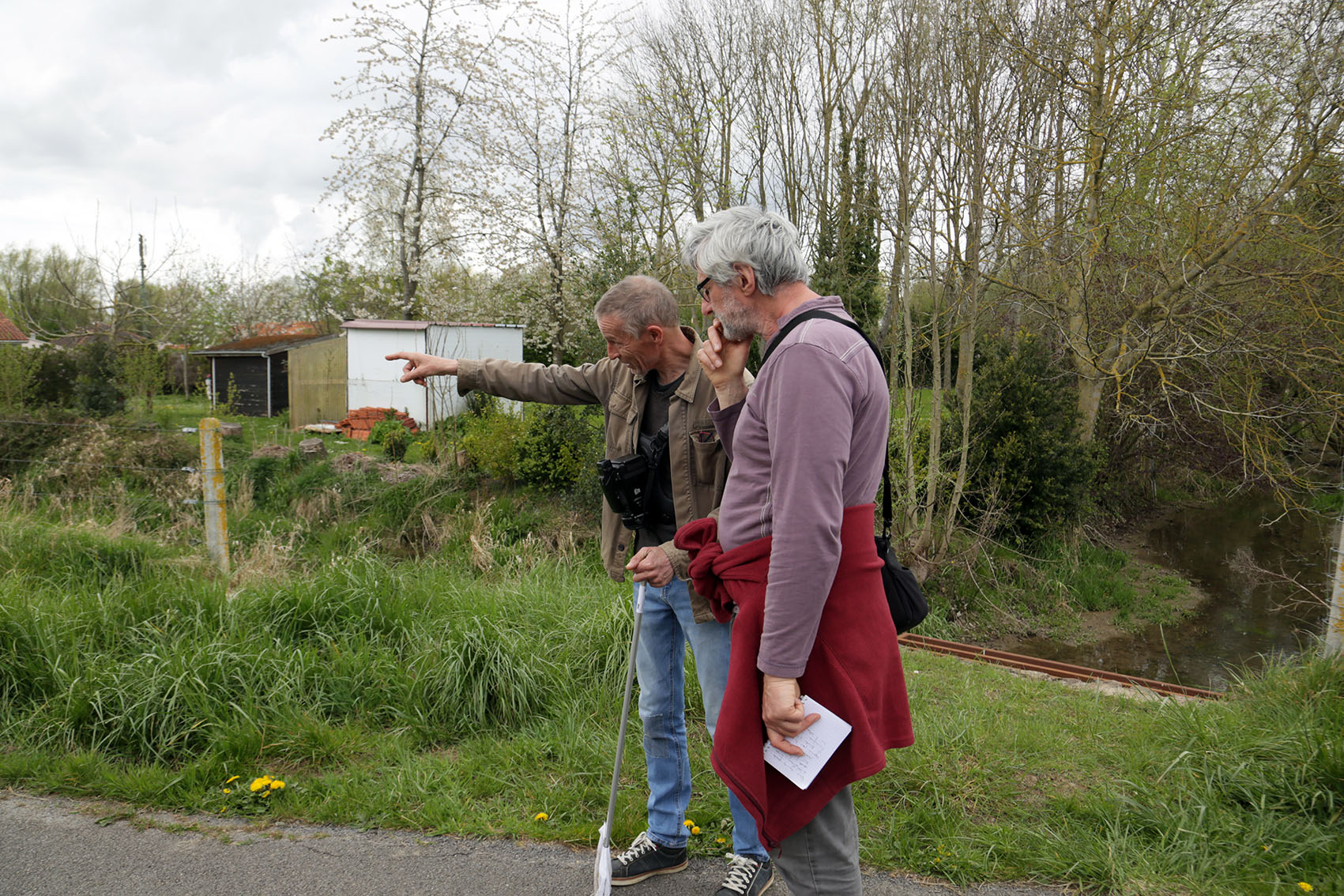 L’homme est aussi curieux de ce que je cherche dans ce coin, me demande si je m’intéresse aux bêtes qui habitent dans le fossé, lui dit que je me préoccupe surtout du cours d’eau, depuis la source jusqu’à l’exutoire… Amandine vient en renfort, parle de son rôle de médiatrice, de ma résidence, du centre d’art Labanque… Je sais mon histoire peu évidente pour nombre de gens que je croise, mais il ne s’étonne pas plus, plutôt intéressé de rencontrer quelqu’un sur son terrain d’action, de pouvoir causer de cet endroit, du cours d’eau.