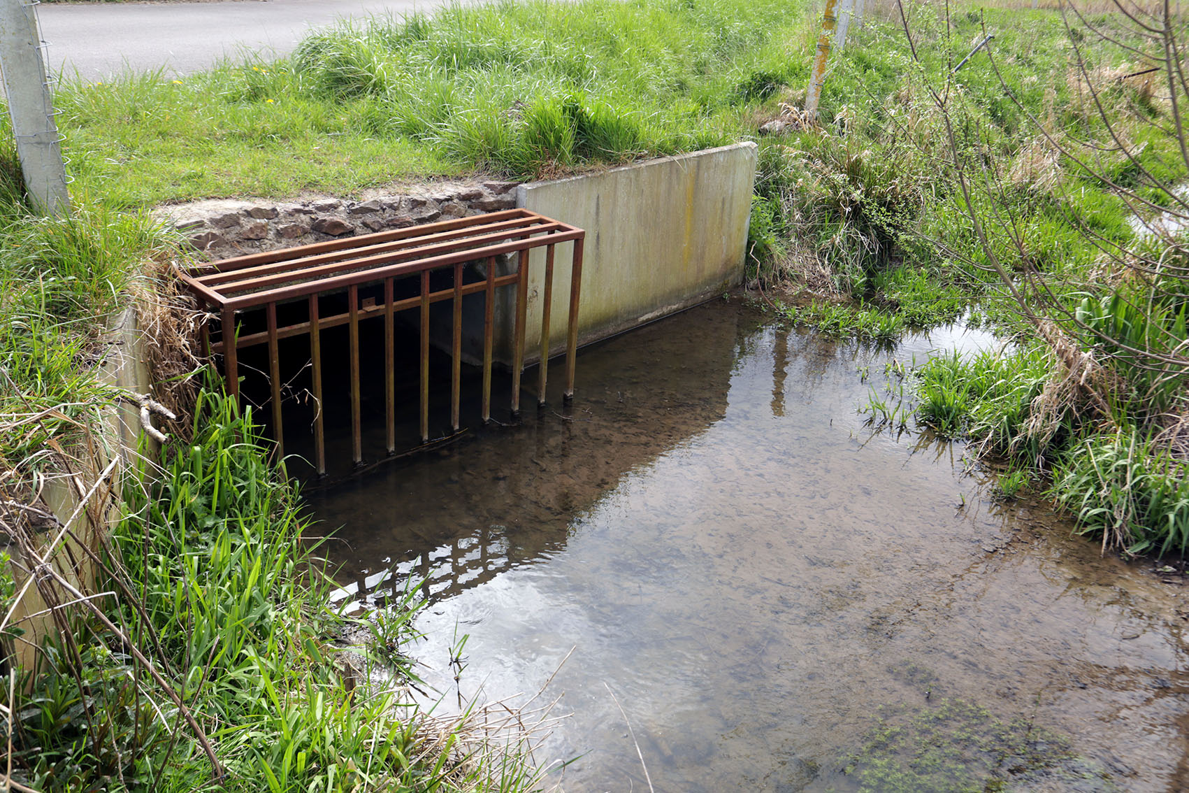 Un ouvrage de béton avec une grille marque la fin du fossé… Le cours d’eau se poursuit, souterrain… Mais l’heure passe, bientôt temps de reprendre la route. Décidons d’aller voir, quand même, jusqu’au rond point que nous avons aperçu à droite, il se trouve sur la RD943.