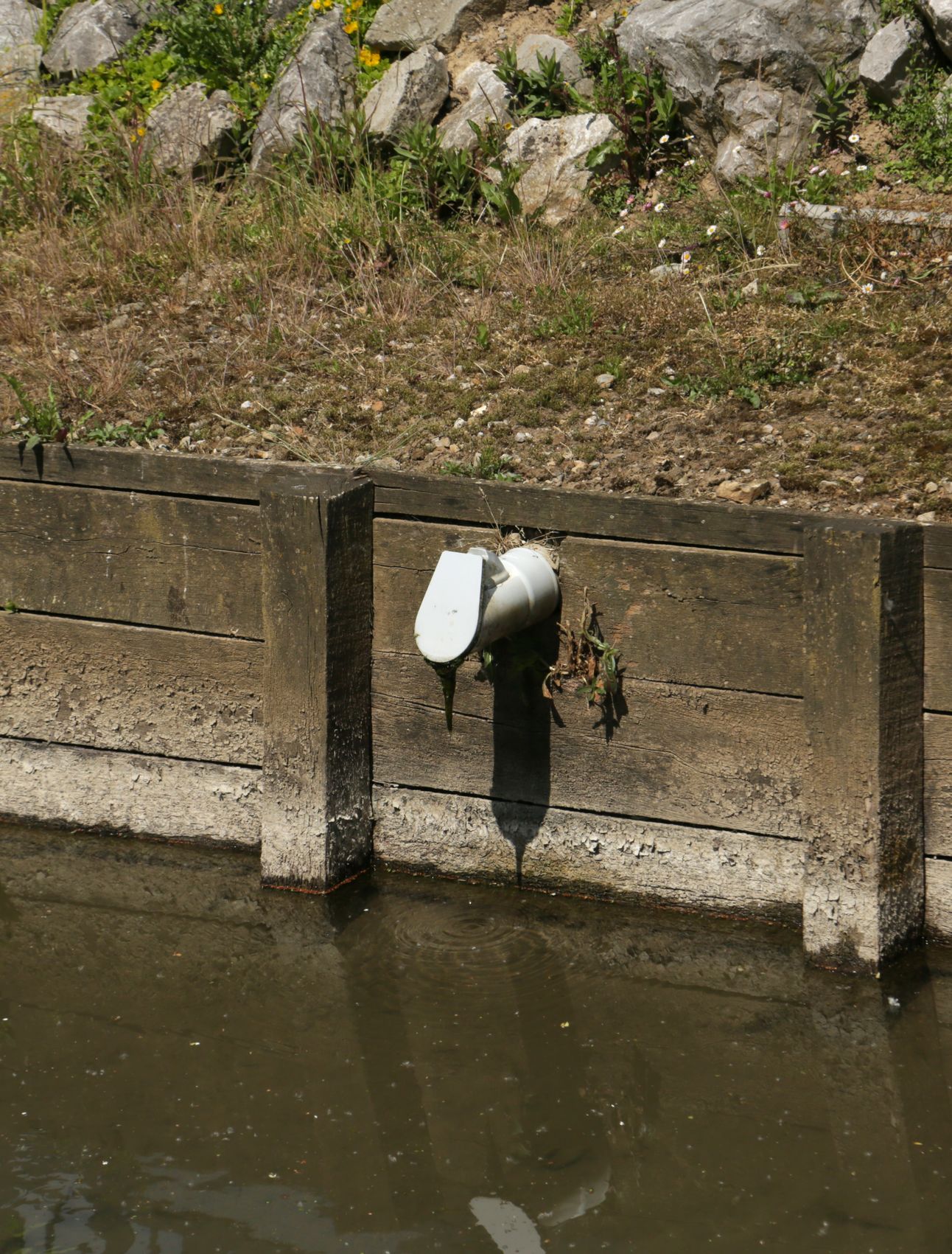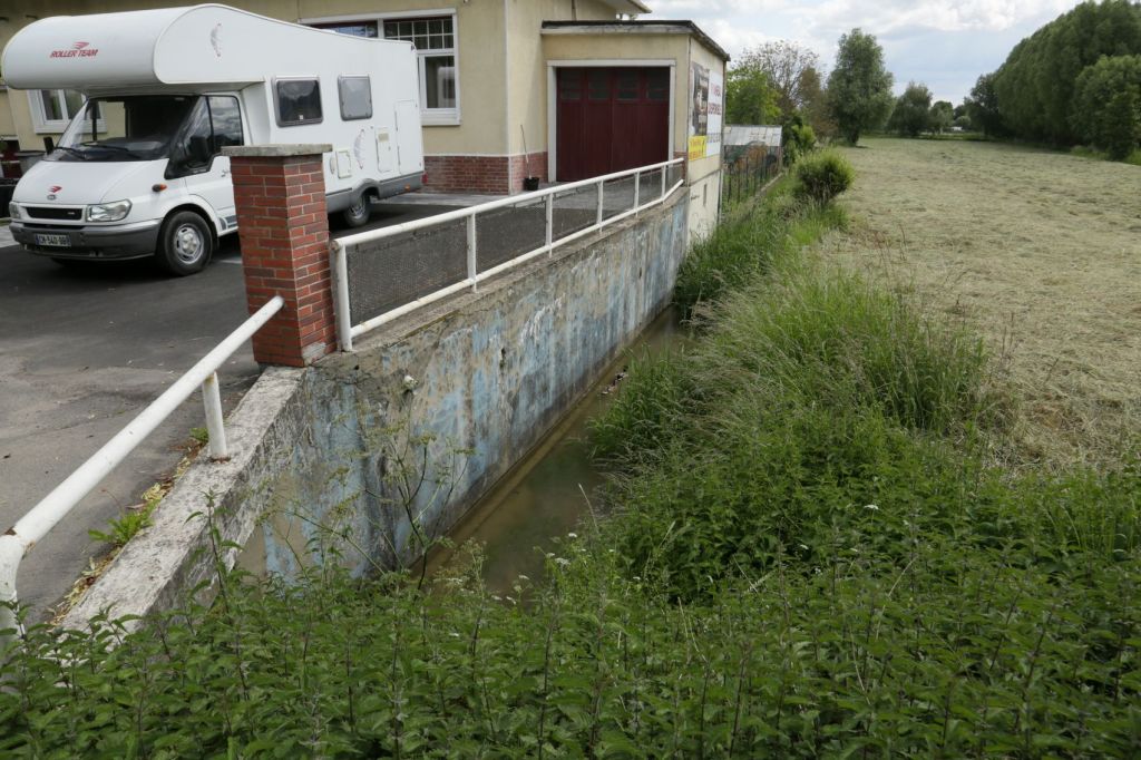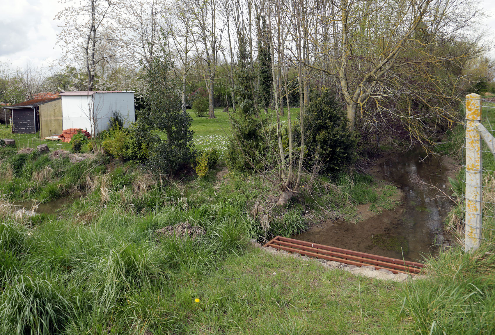 Au bout d’une cinquantaine de mètres, au détour d’une maison, un ouvrage de béton au sol, à peine visible. Mon cours d’eau vient mourir juste là…, semblant buter contre la digue qui le sépare du canal. C’est à la fois une déception et un soulagement de retrouver la Laque-Lacquette, finir ainsi… Mais… Ce n’est pas la fin : juste un siphon !… Le signale que le cours d’eau ne se jette pas dans le canal, mais doit poursuivre son chemin par-dessous… Un manie ici.